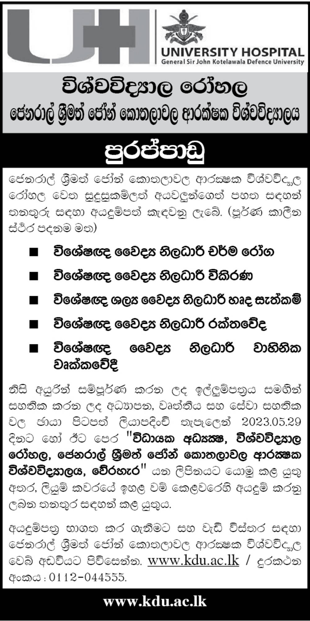 Special Medical Officer Dermatology, Special Medical Officer Radiology - General Sir John Kotelawala Defence University