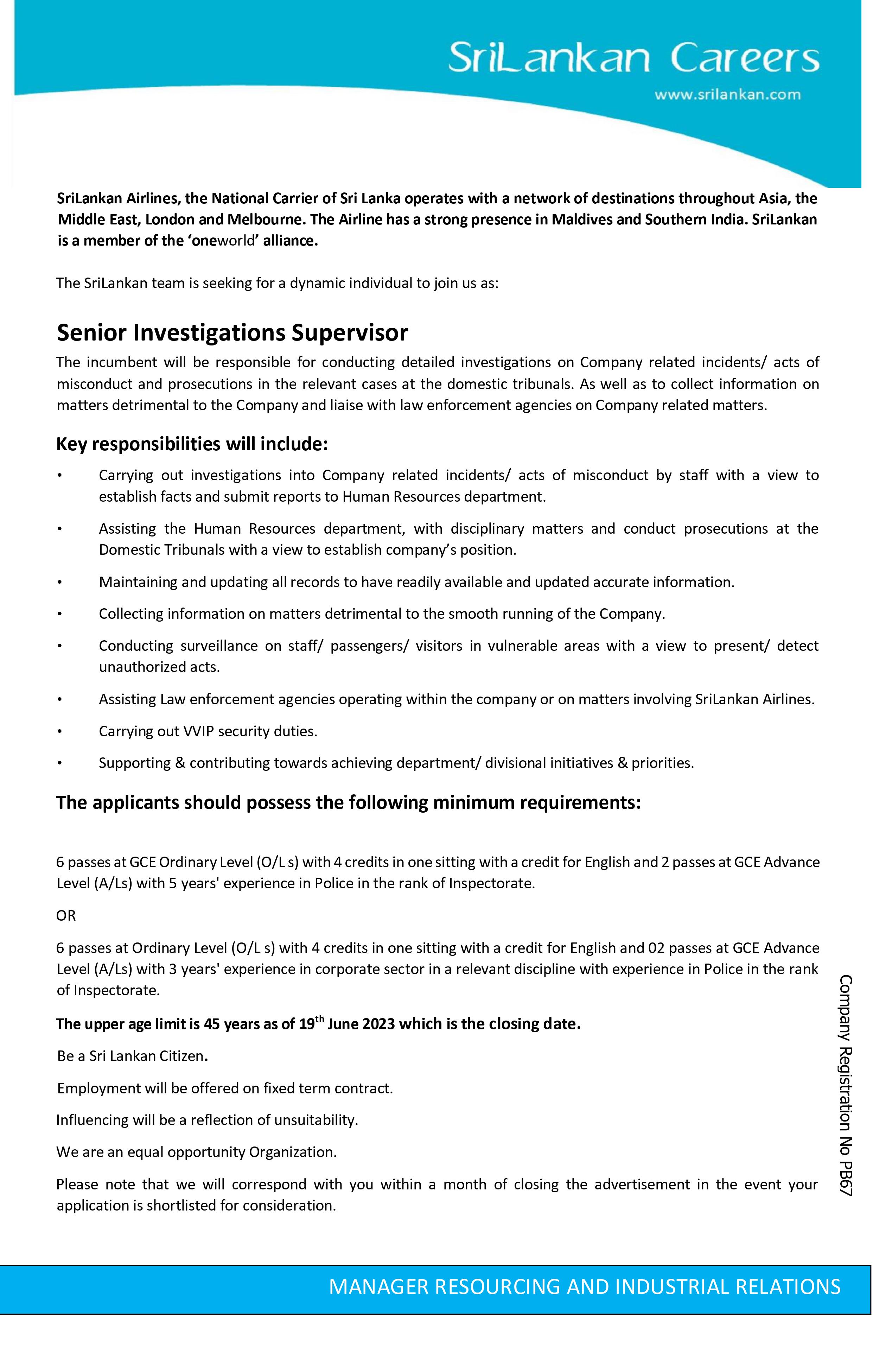 Senior Investigation Supervisor - Sri Lankan Airlines