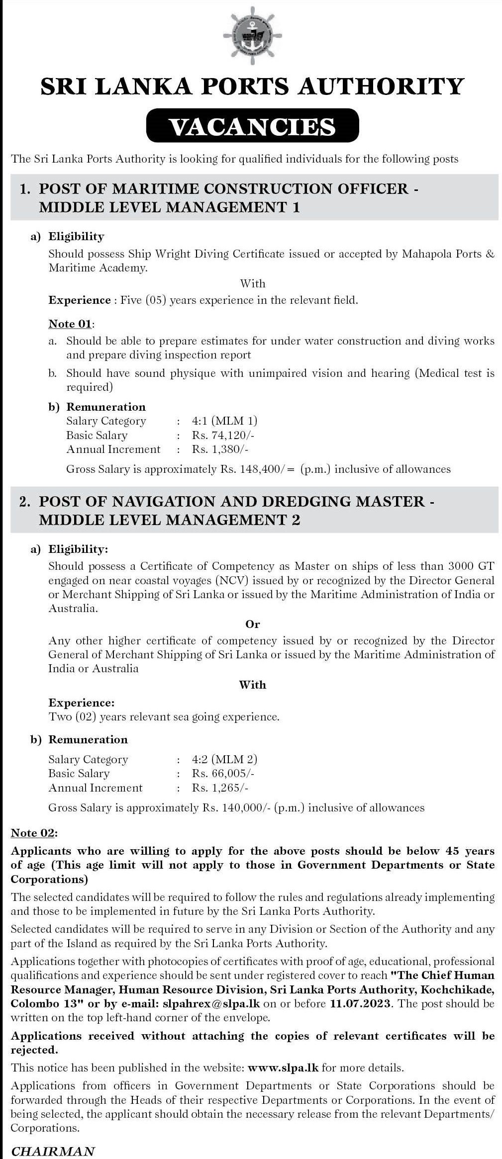 Maritime Construction Officer, Assistant Navigation & Dredging Master - Sri Lanka Ports Authority
