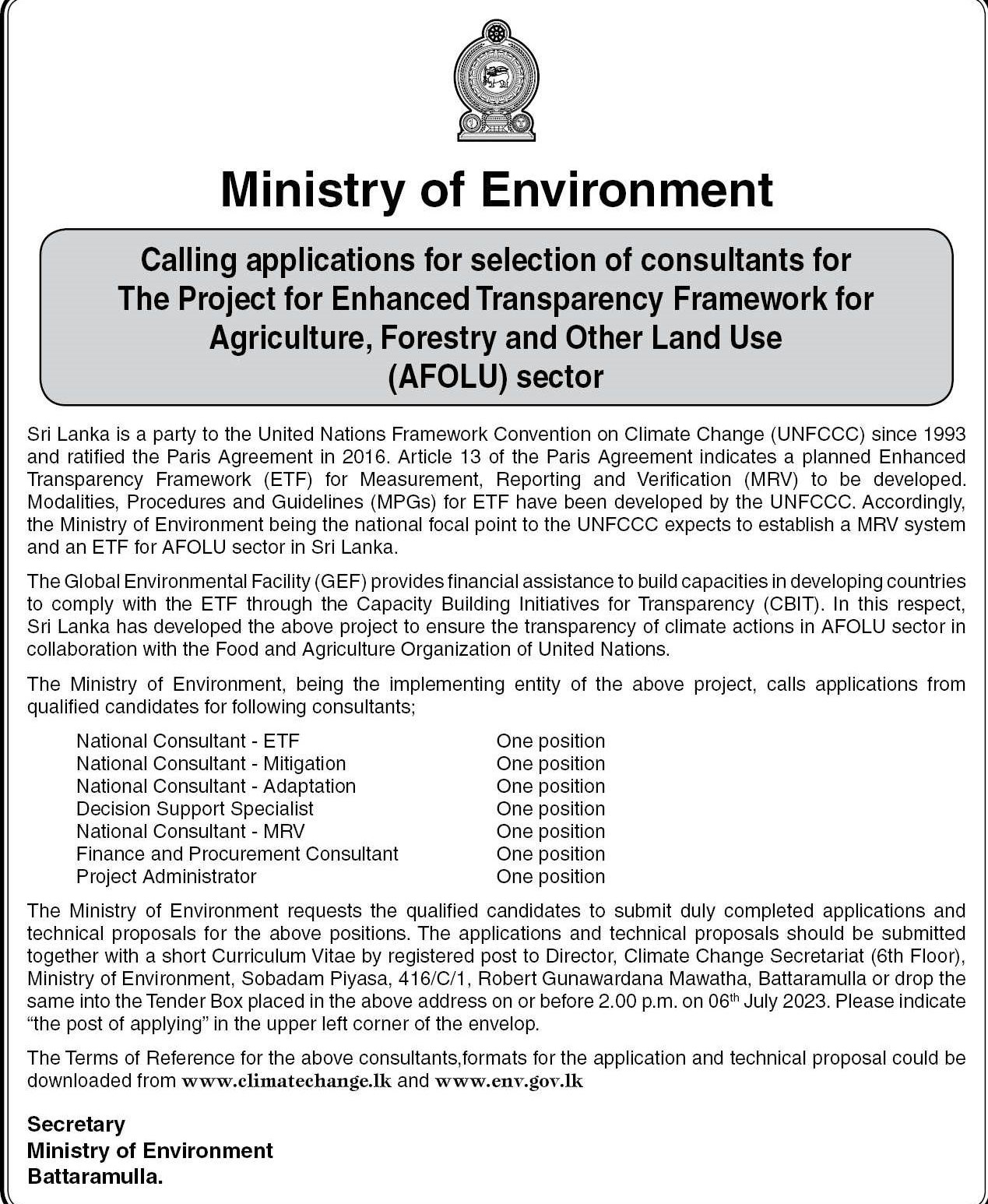National Consultant ,Decision Support Specialist, Project Administrator - Ministry of Environment