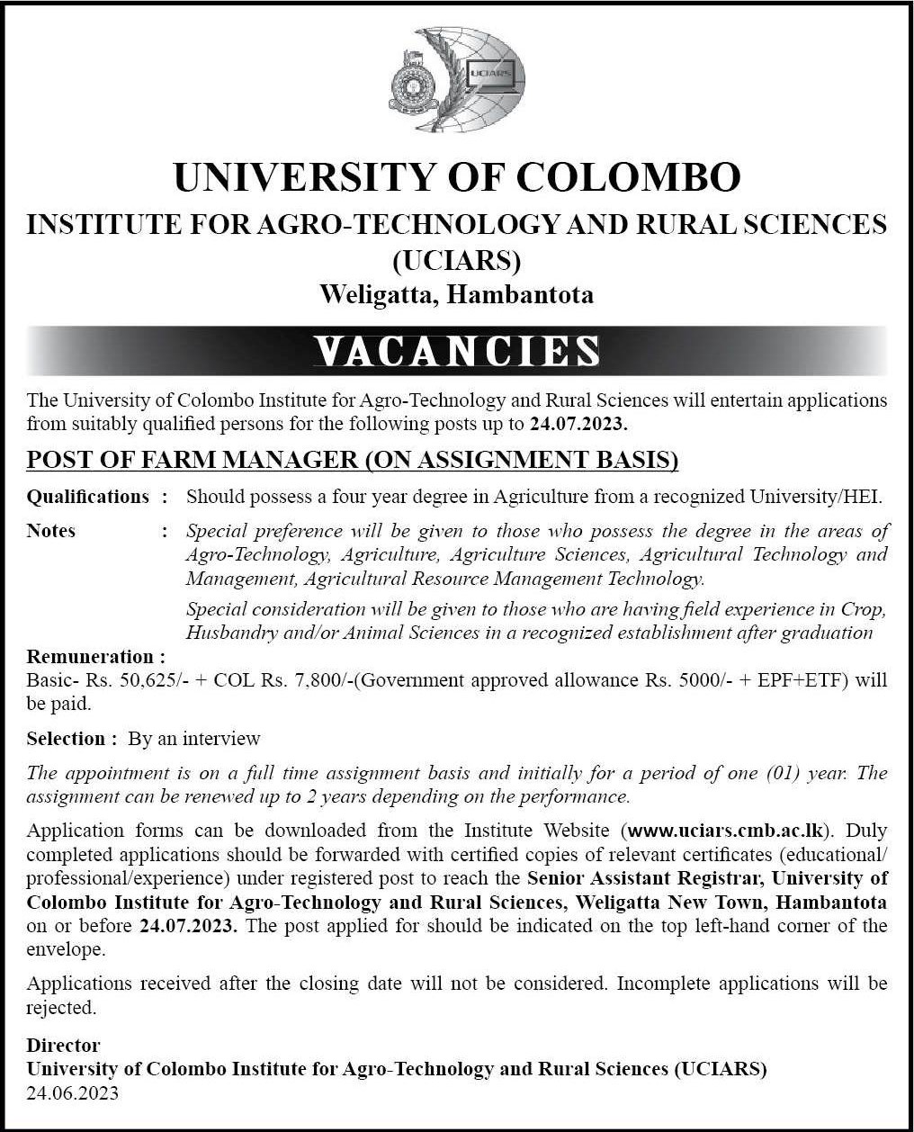 Farm Manager - University of Colombo