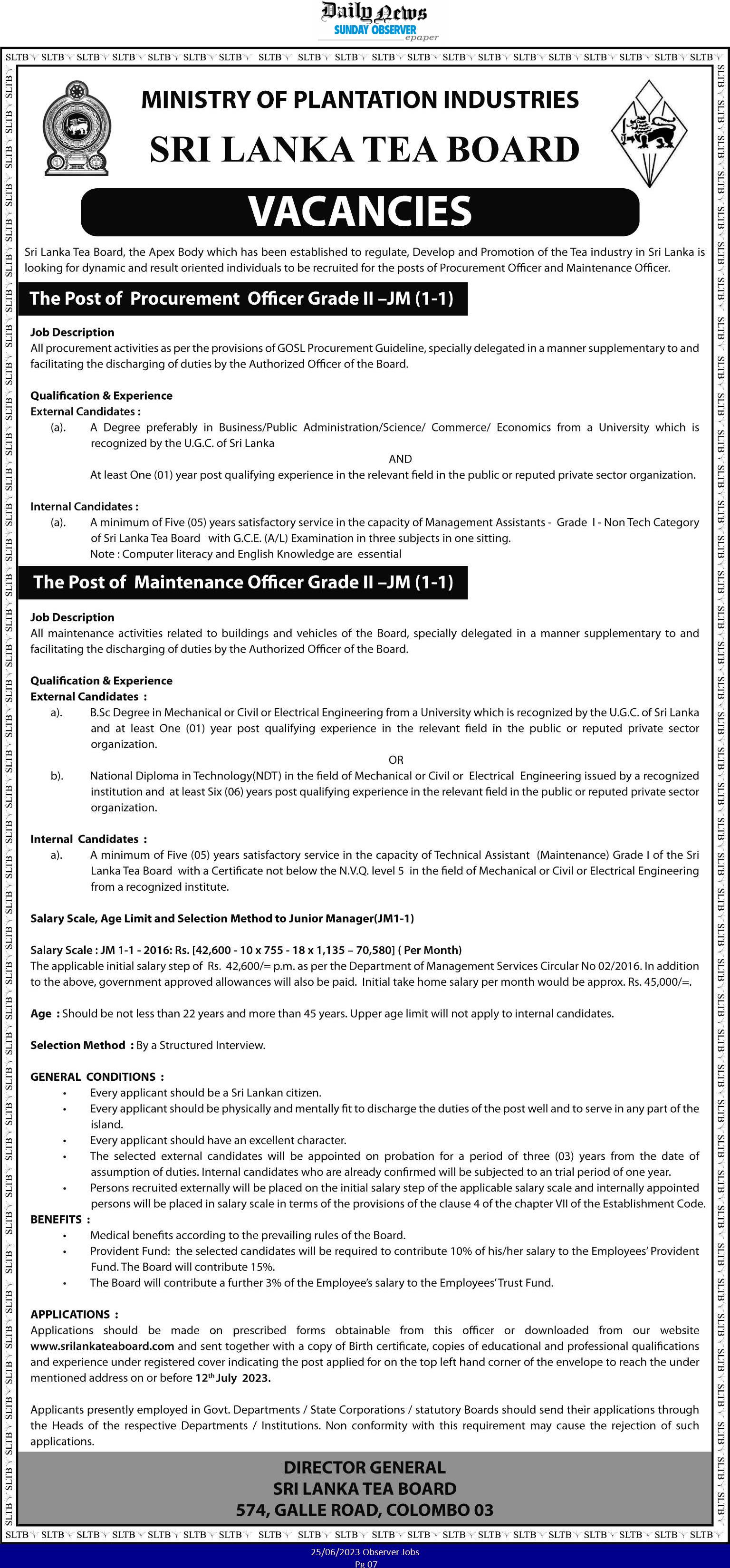 Procurement Officer, Maintenance Officer - Sri Lanka Tea Board