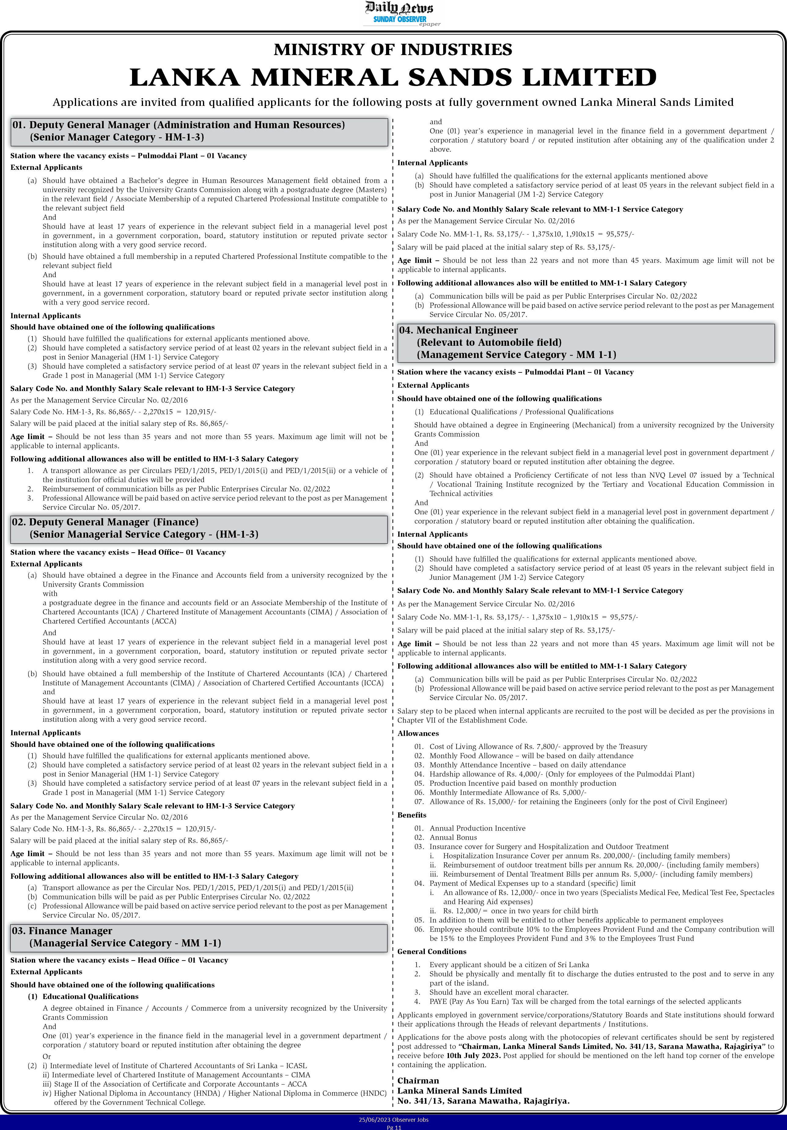 Deputy General Manager, Finance Manager, Mechanical Engineer - Lanka Mineral Sands Ltd
