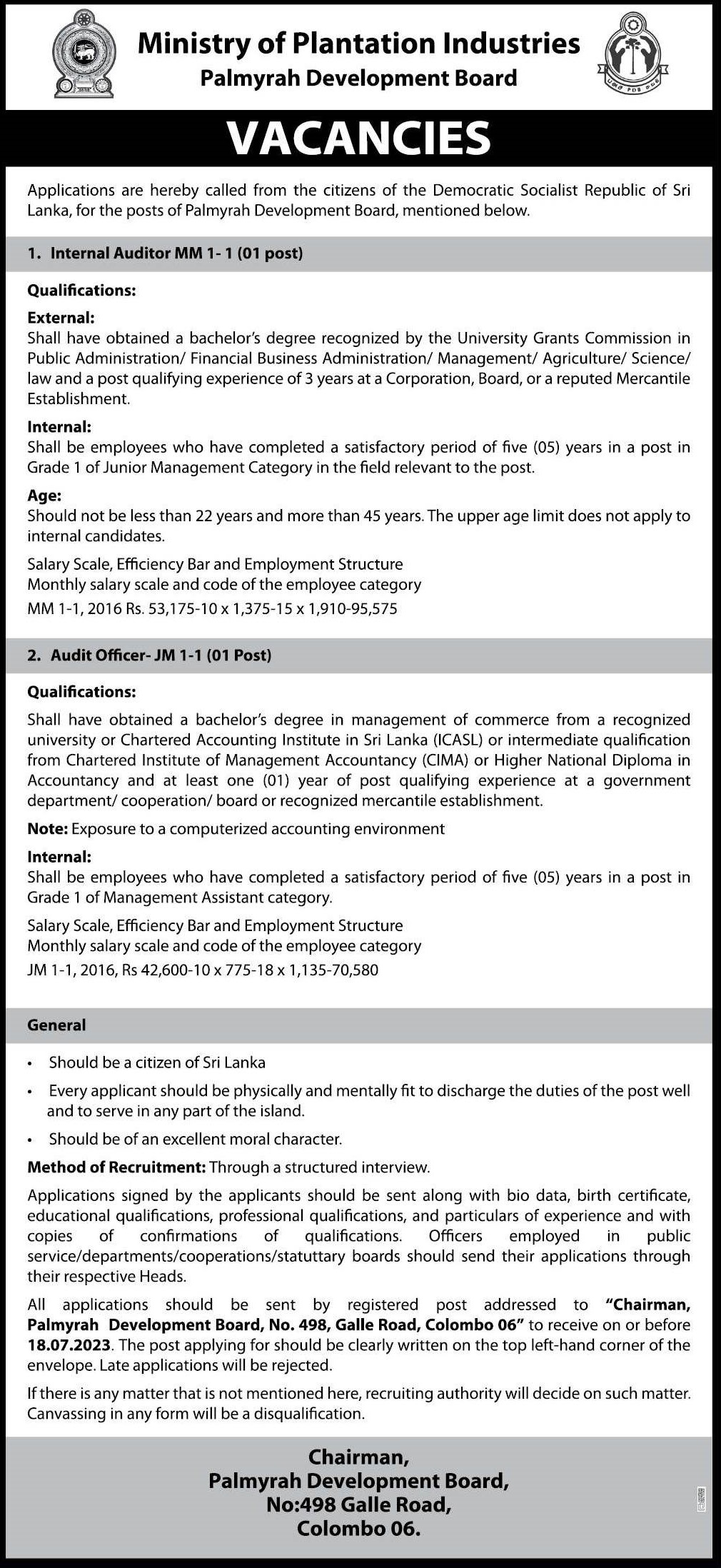 Internal Auditor, Audit Officer - Palmyrah Development Board