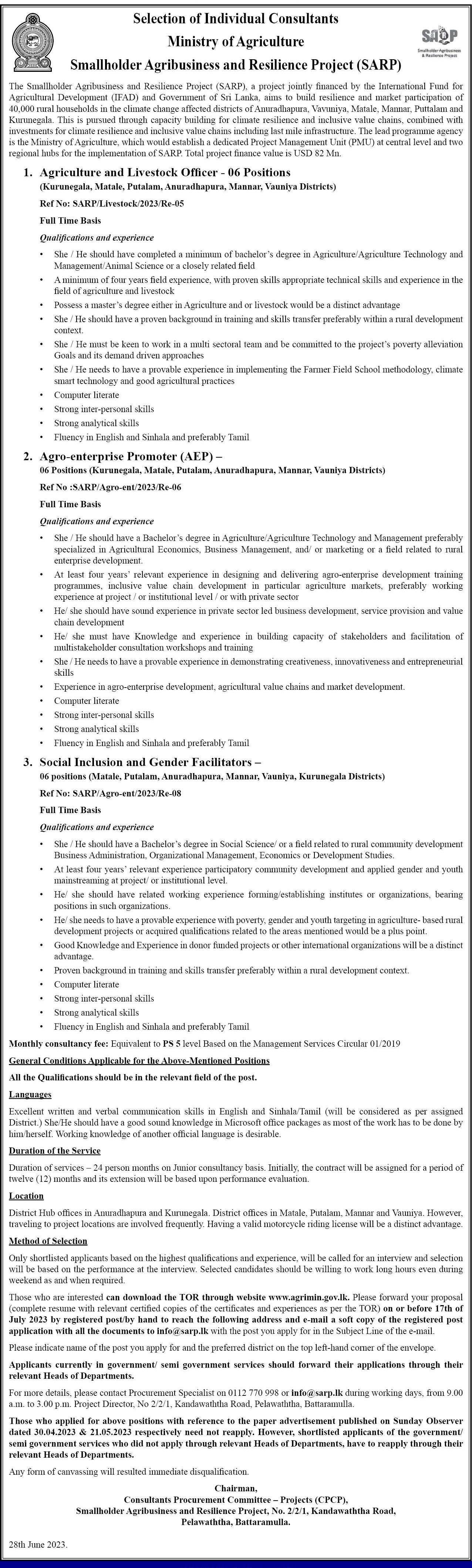 Livestock Officer, Agro Enterprise Promoter, Gender Facilitators - Ministry of Agriculture