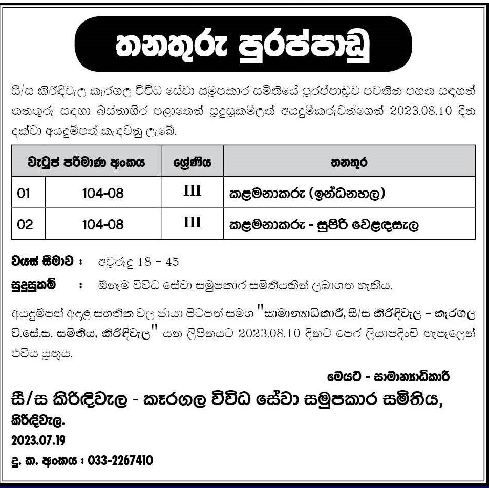 Manager - Kiridiwela Keragala Multipurpose Co-operative Society Limited