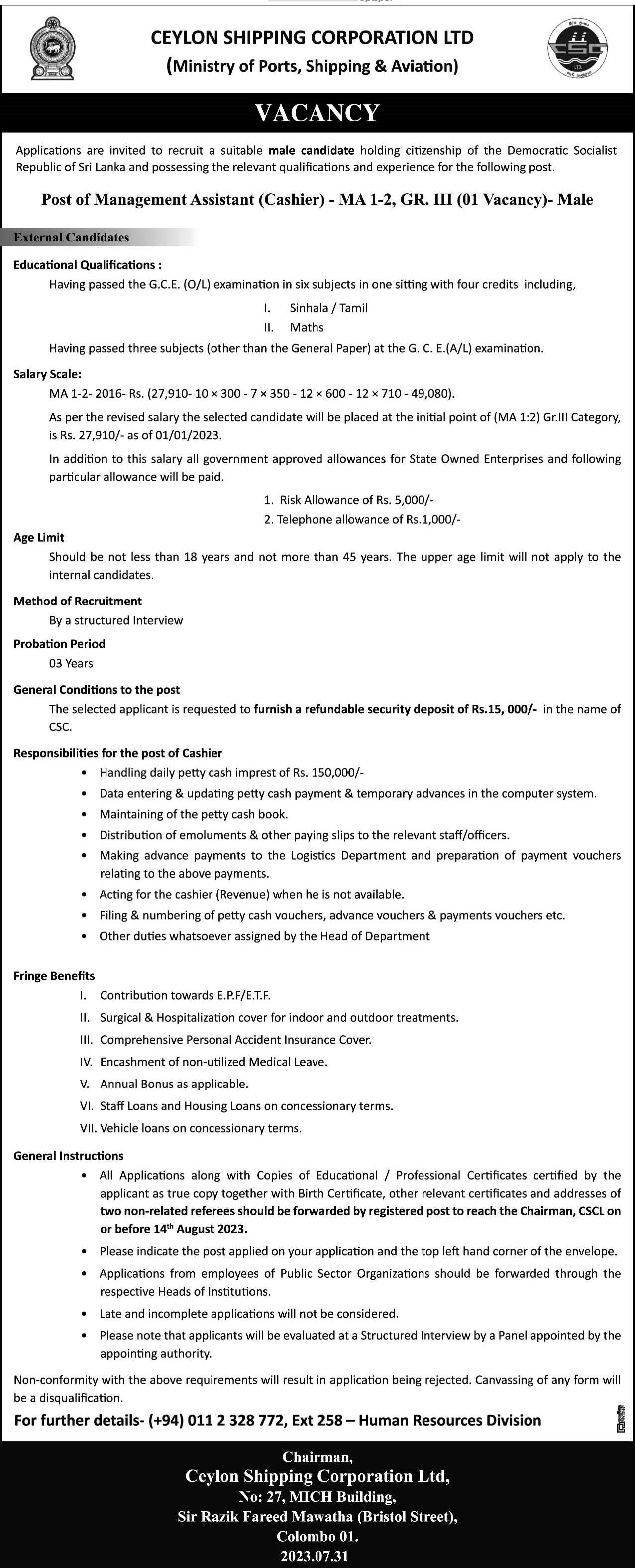 Management Assistant - Ceylon Shipping Corporation Ltd