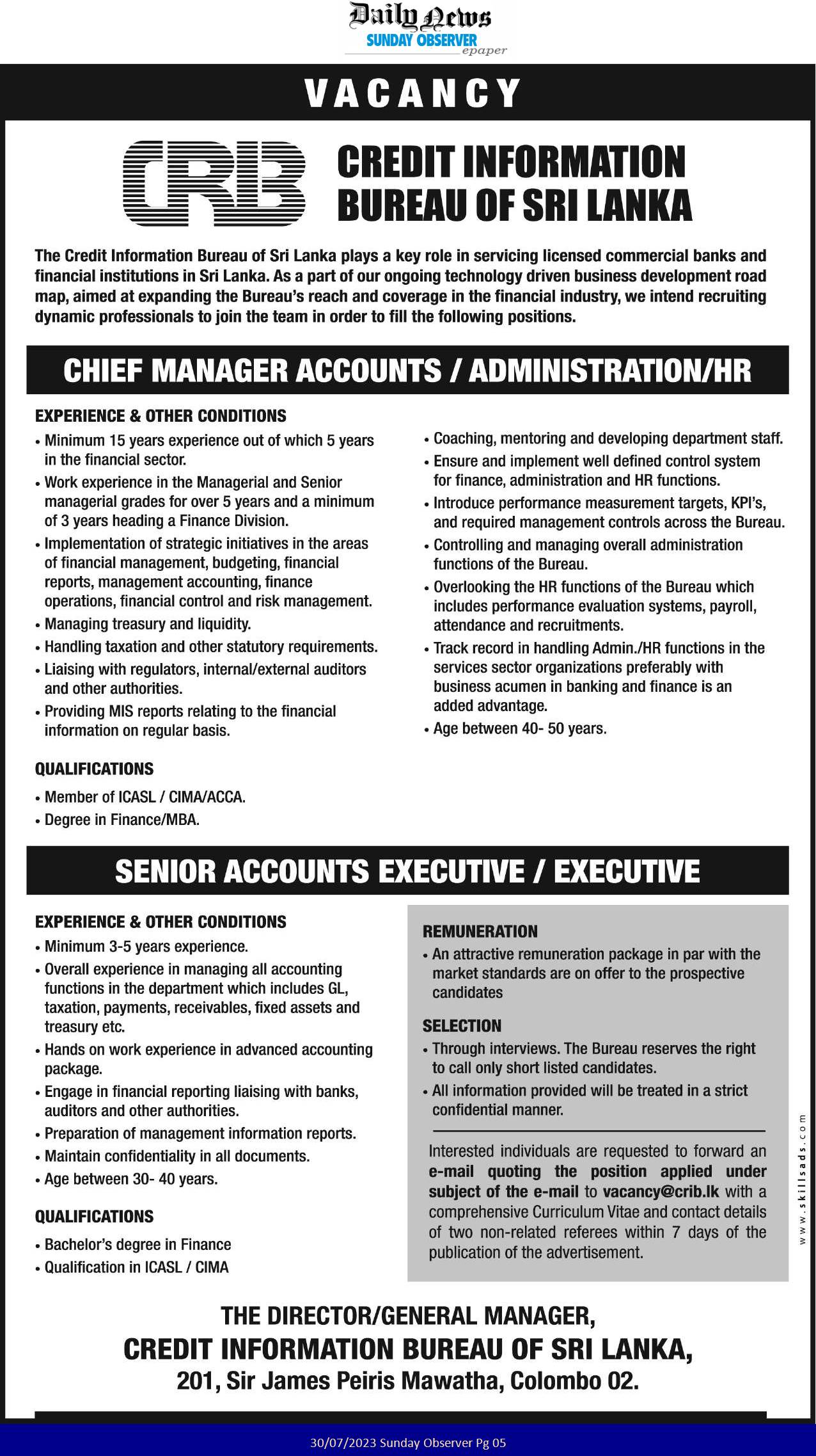 Chief Manager, Senior Executive, Executive - Credit Information Bureau of Sri Lanka