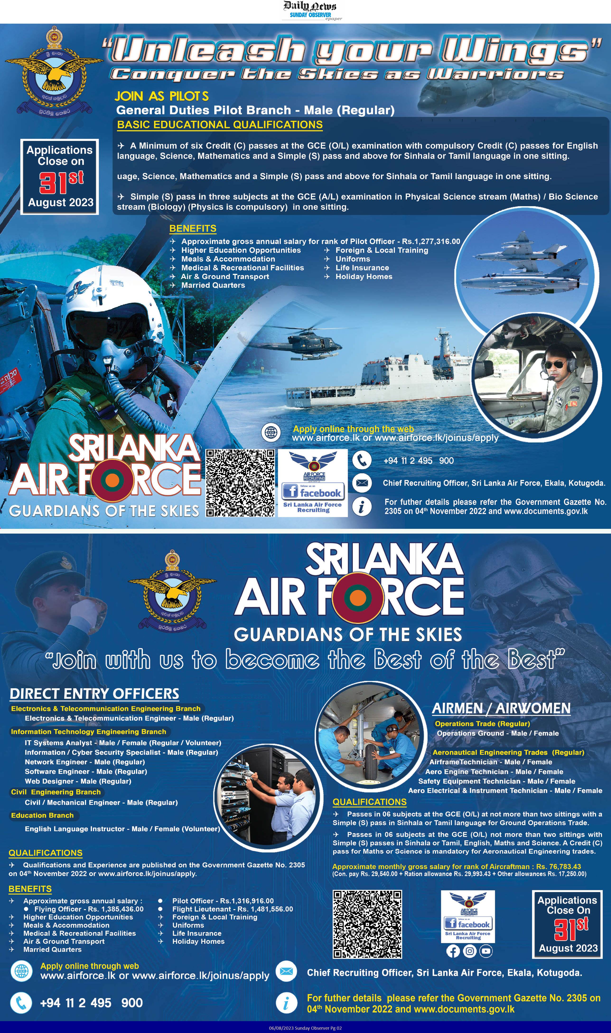 Pilot, ICT Systems Analyst, Electronics & Telecommunication Engineer - Sri Lanka Air Force