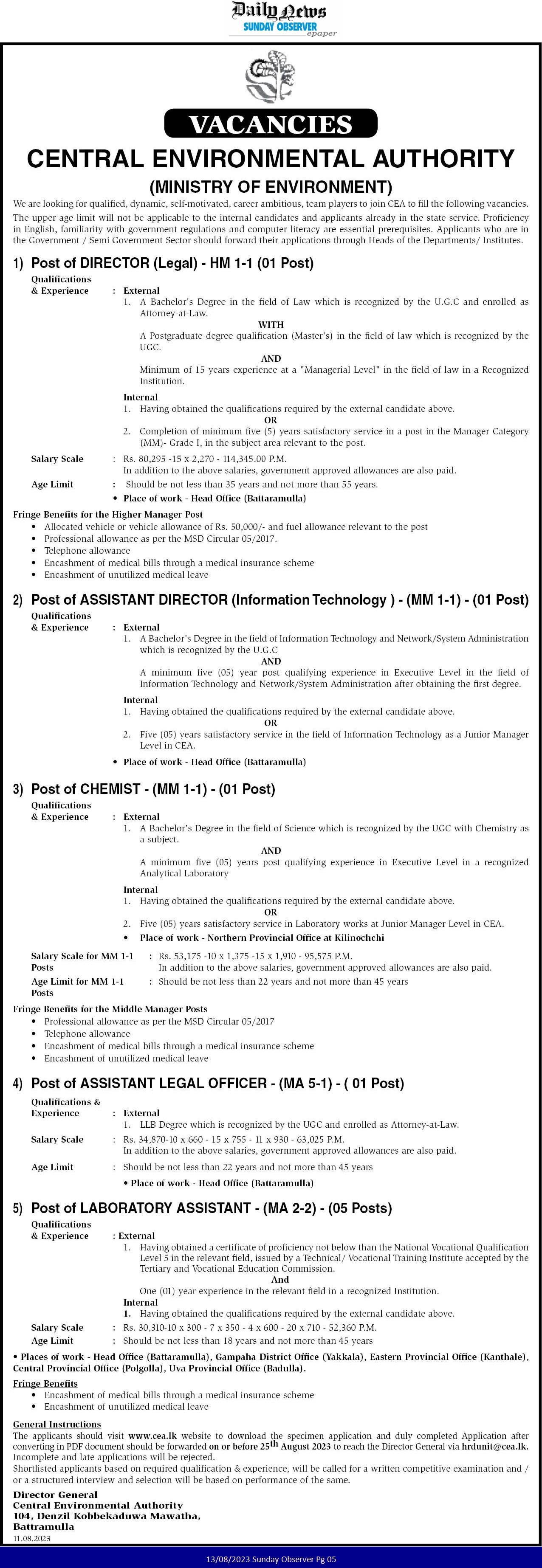 Director, Assistant Director, Chemist, Legal Officer, Laboratory Assistant - Central Environmental Authority