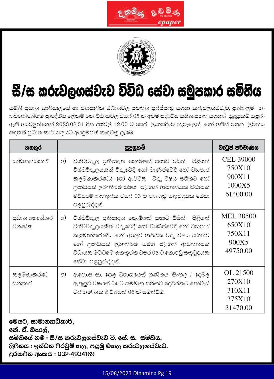 General Manager, Chief Internal Auditor, Management Assistant - Karuwalagaswewa Co-operative Society Ltd