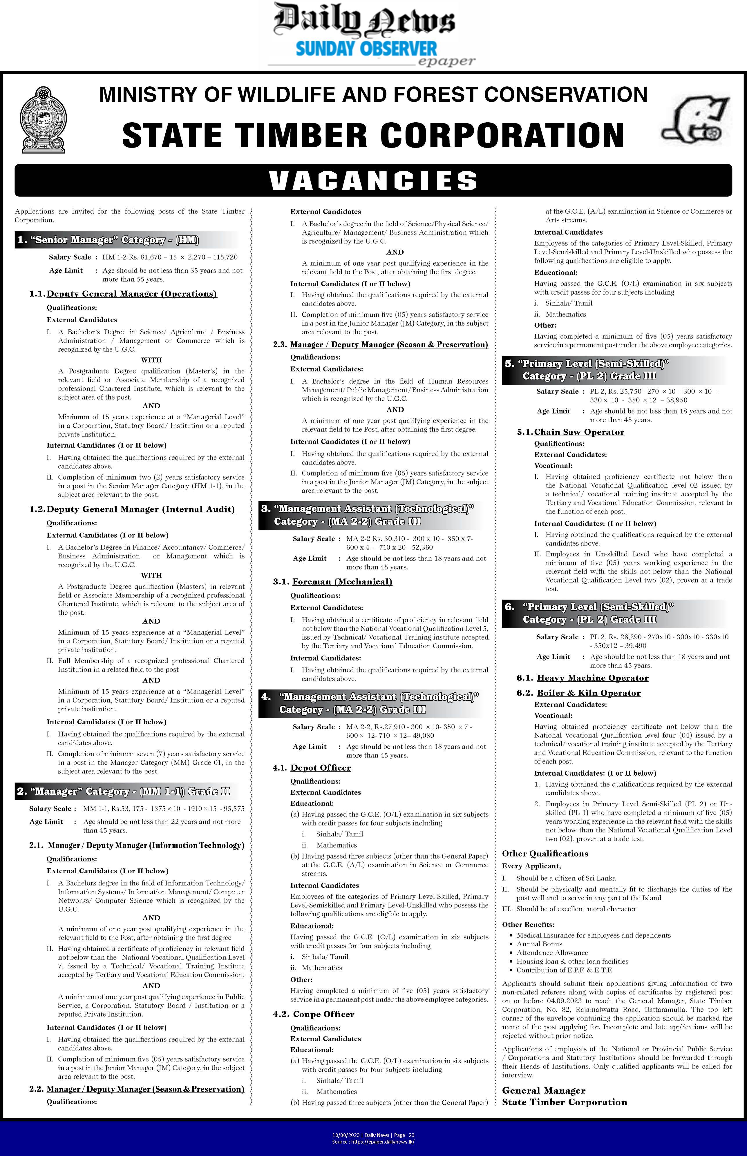 Senior Manager, Manager, Management Assistant - State Timber Corporation