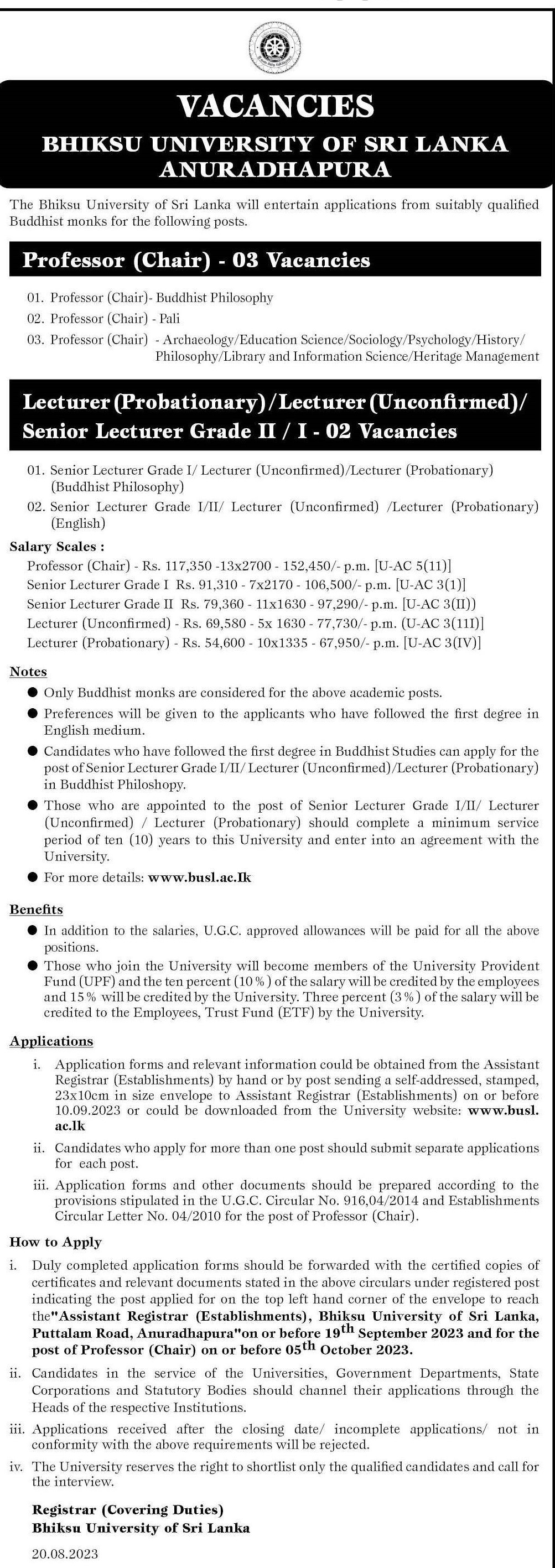 Professor, Senior Lecturer, Lecturer - Bhiksu University of Sri Lanka