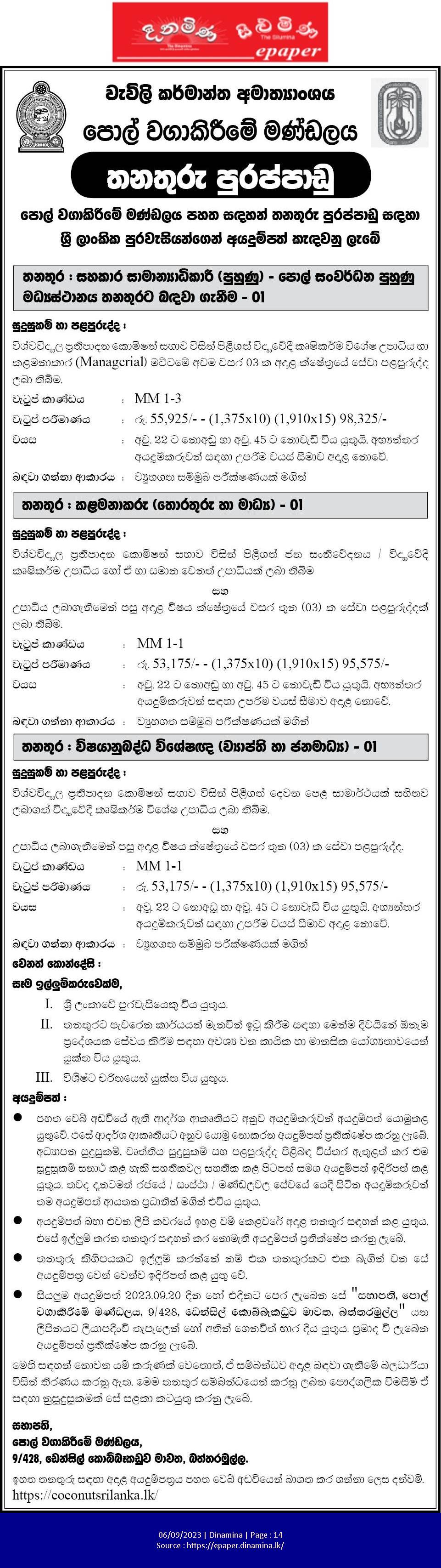 General Manager, Manager, Subject matter expert - Coconut Cultivation Board