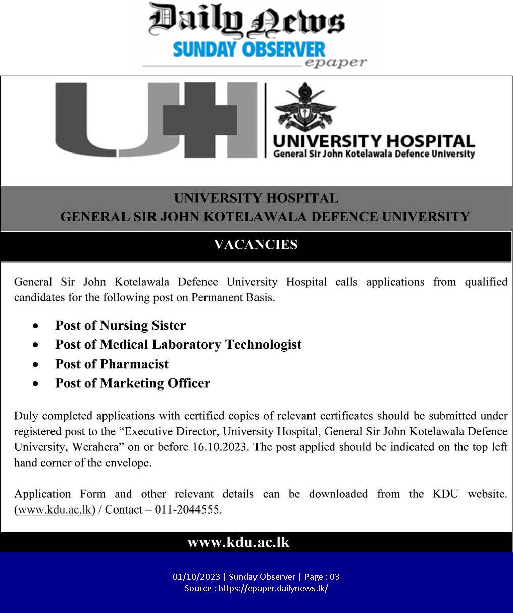 Nurse, Medical Laboratory Technician, Pharmacist - General Sir John Kotelawala Defence University Hospital