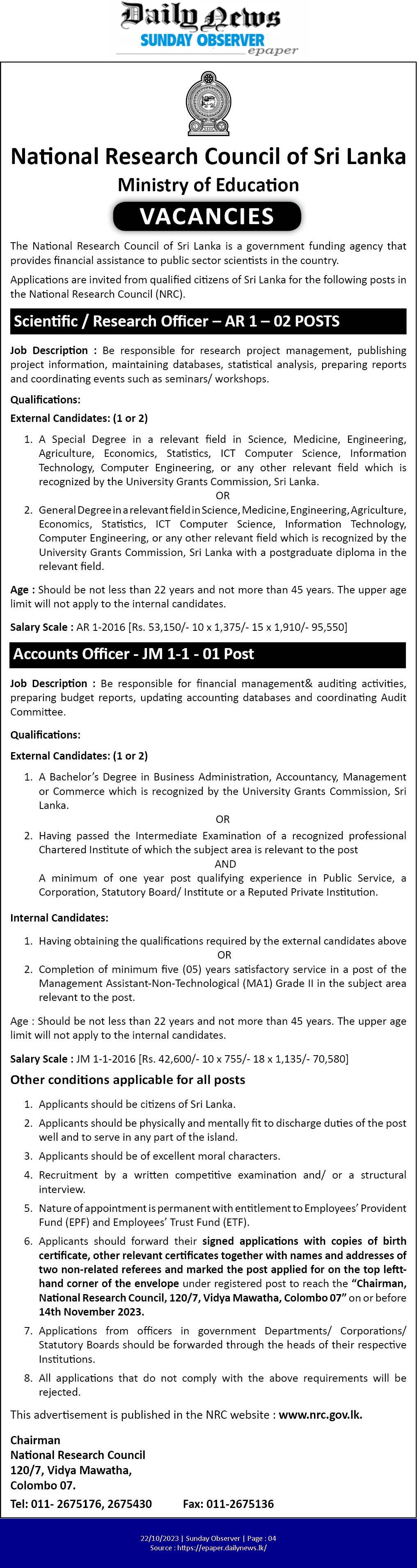 Research Officer, Accounts Officer - National Research Council of Sri Lanka
