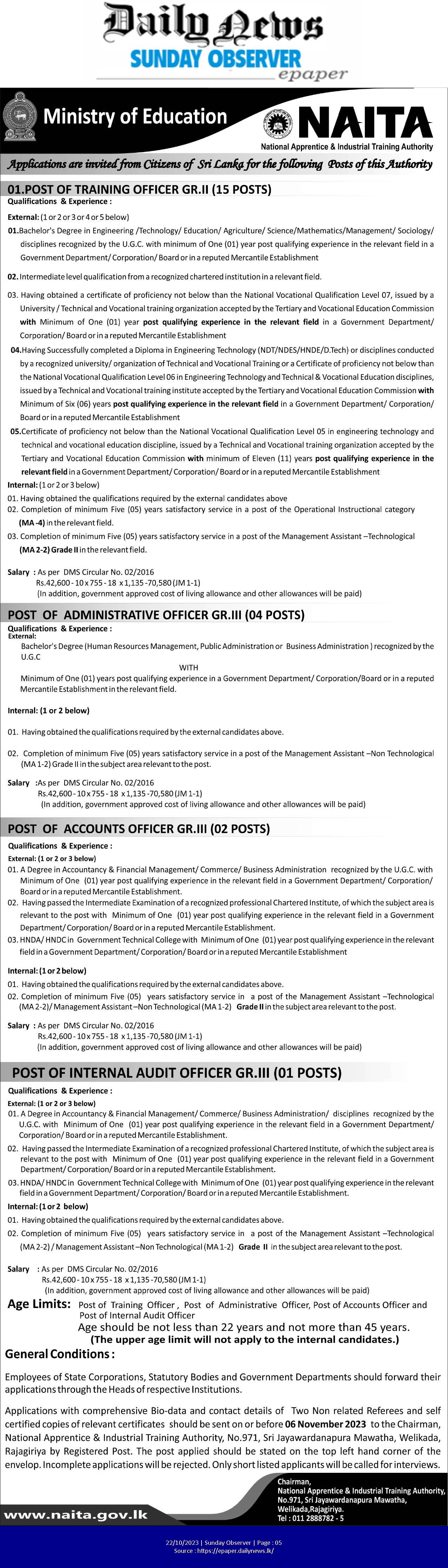 Training Officer, Administrative Officer, Accounts Officer, Internal Audit Officer - National Apprentice and Industrial Training Authority