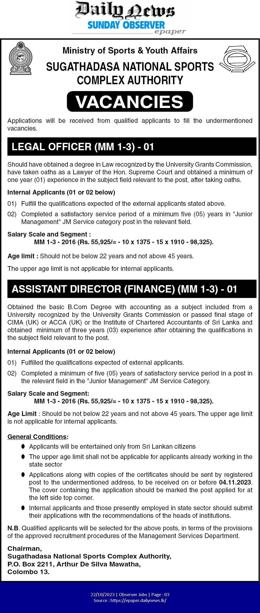Legal Officer, Assistant Director - Sugathadasa National Sports Complex Authority