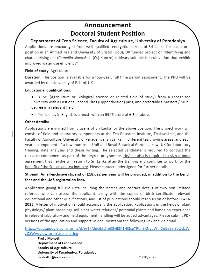 Doctoral Student Position - Sri Lanka Tea Research Board