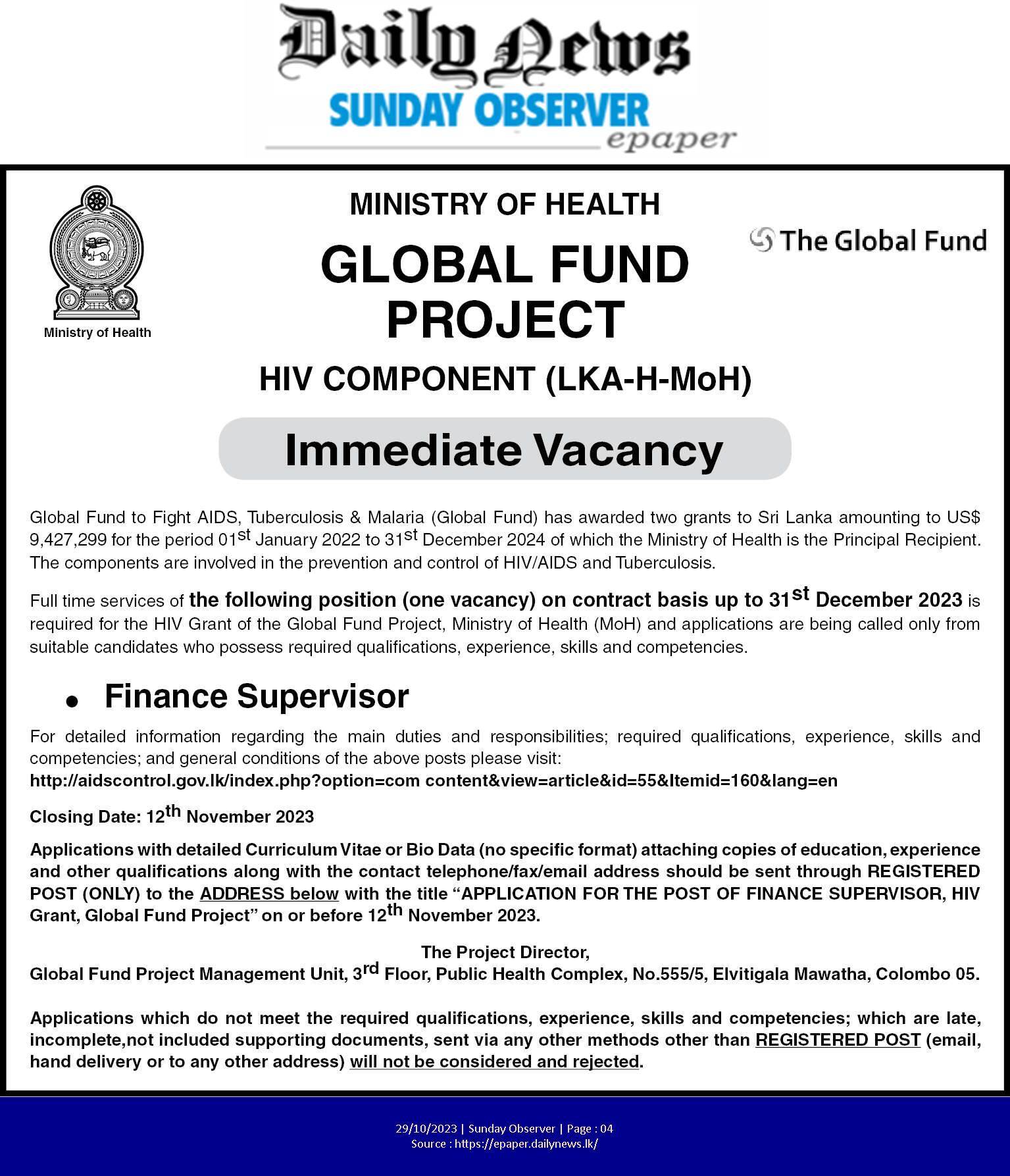 Finance Supervisor - Ministry of Health