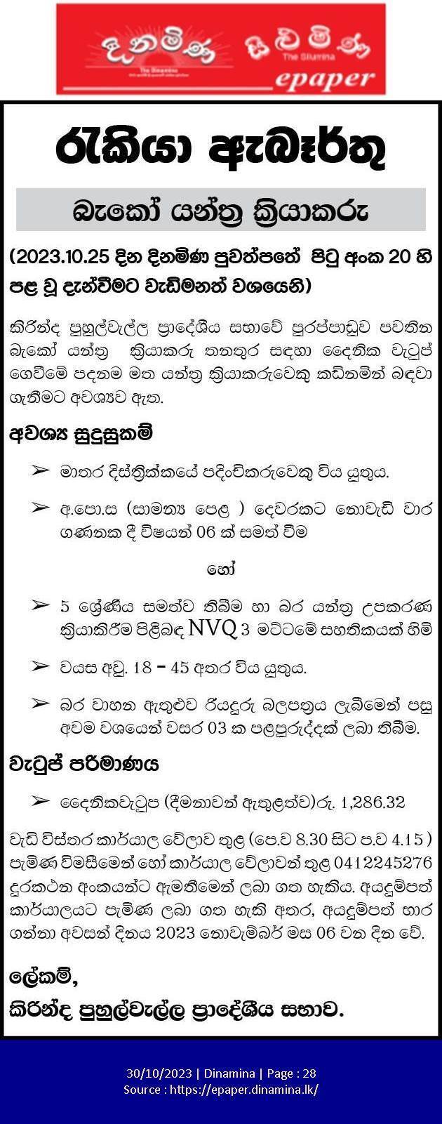 Machine Operator - Kirinda Puhulwella Pradeshiya Sabha