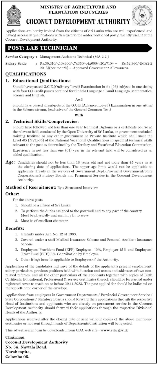Lab Technician - Coconut Development Authority