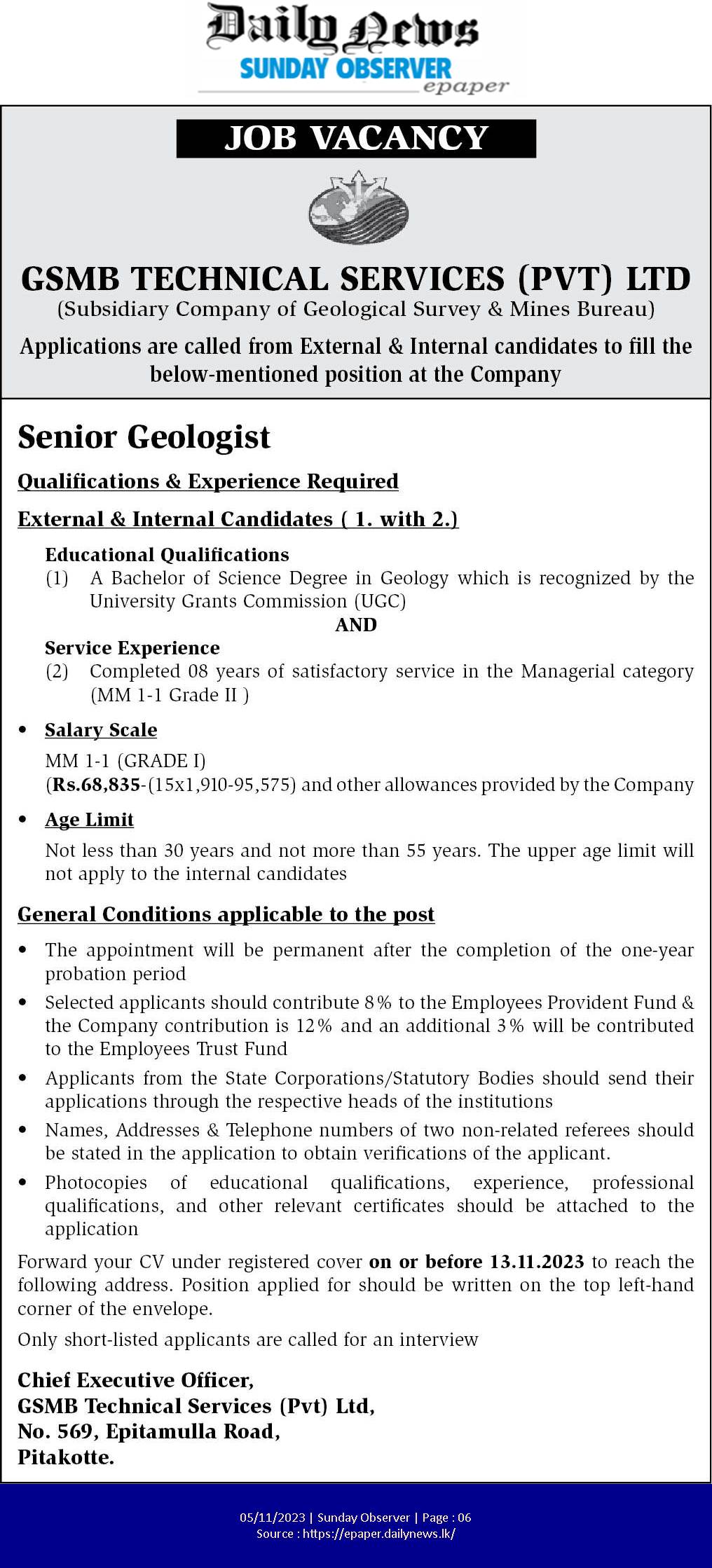 Senior Geologist - GSMB Technical Services (Pvt) Ltd