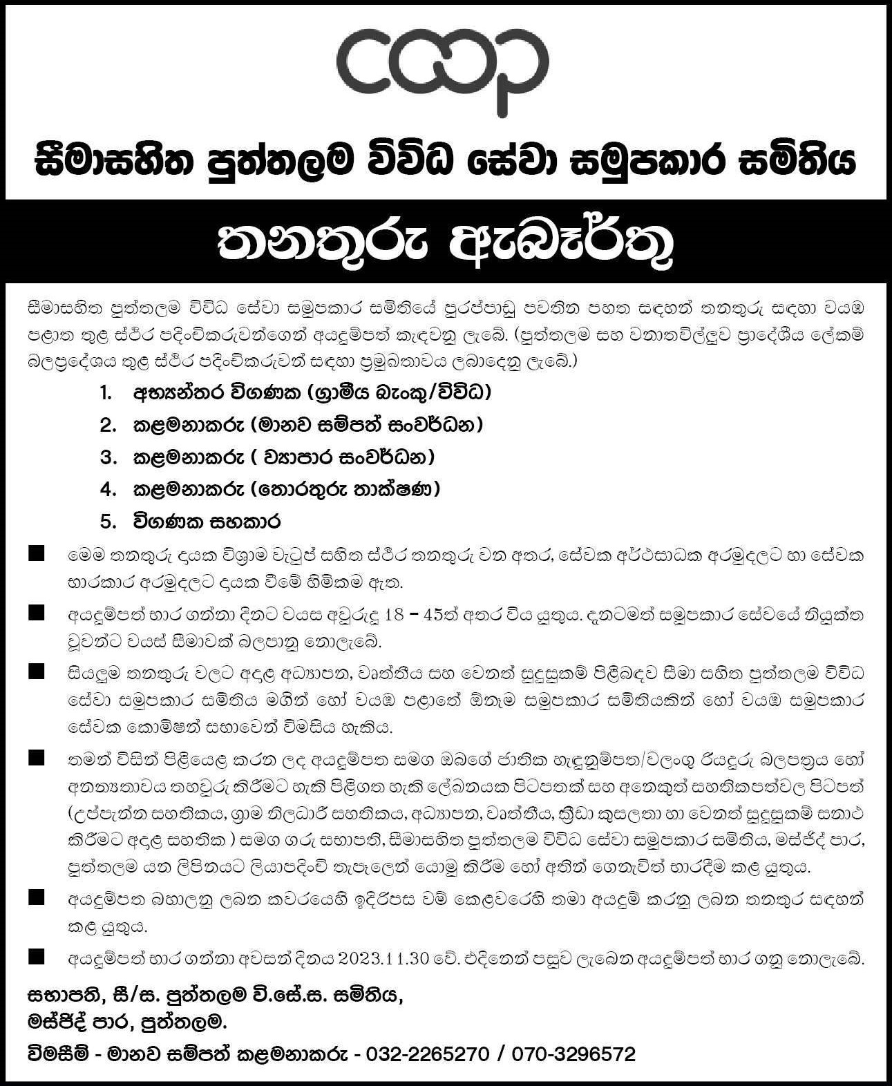 Internal Auditor, Manager, Audit Assistant - Puttalam Multipurpose Co-operative Society Limited