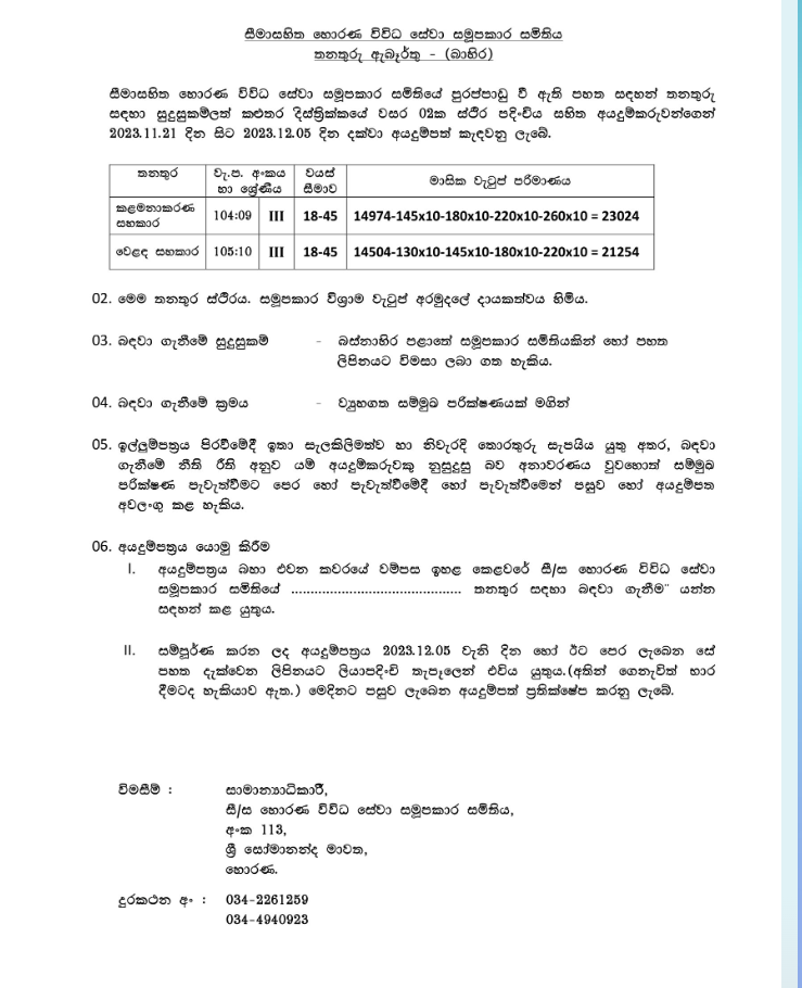 Management Assistant, Sales Assistant - Horana Multi Purpose Cooperative Society Ltd