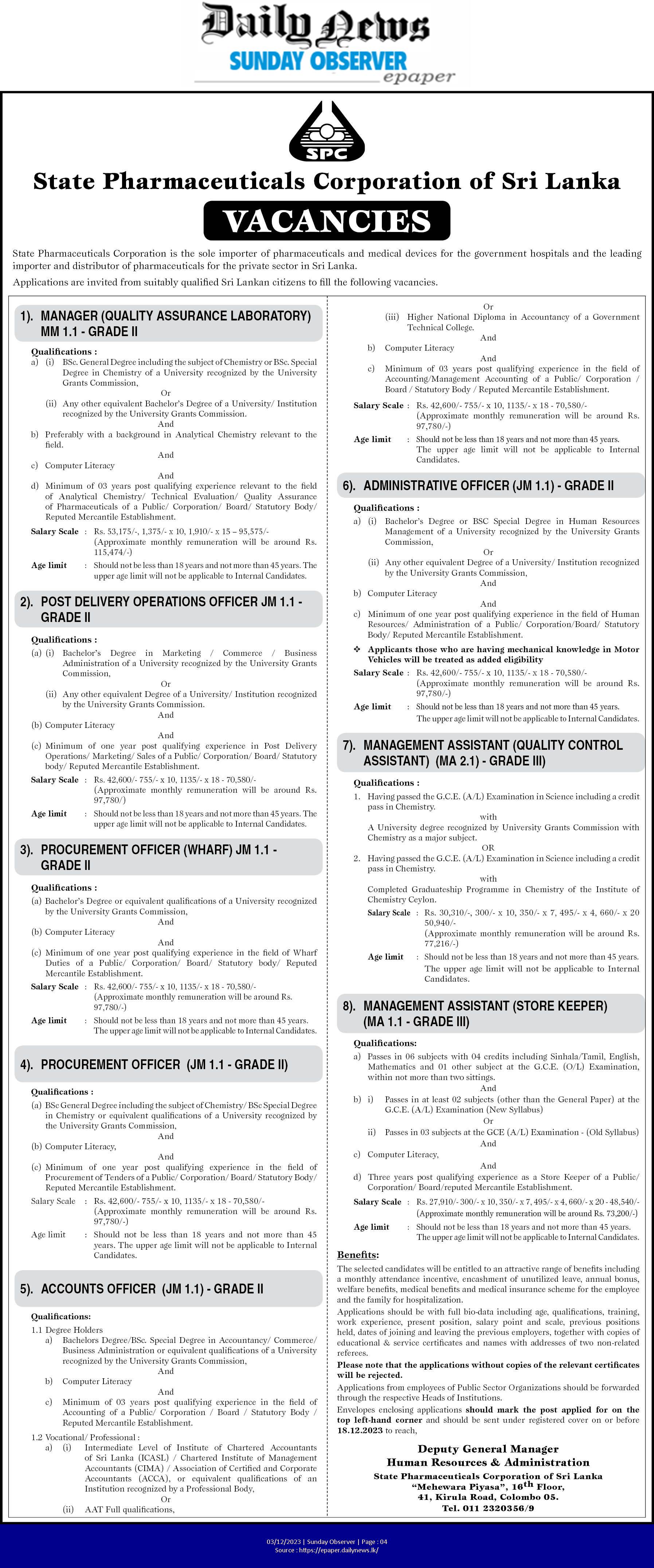 Manager, Delivery Operation Officer, Management Assistant - State Pharmaceuticals Corporation of Sri Lanka