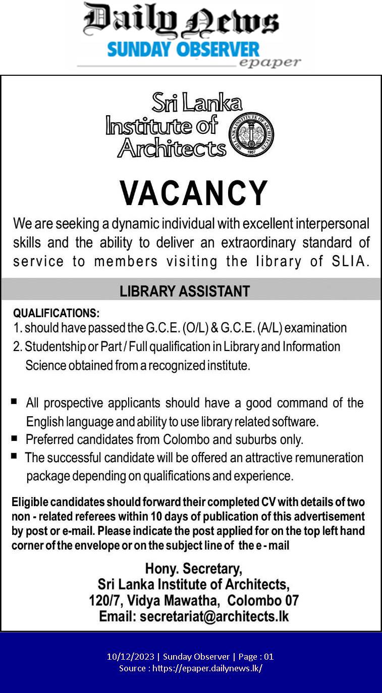 Assistant Librarian - Sri Lanka Institute of Architects