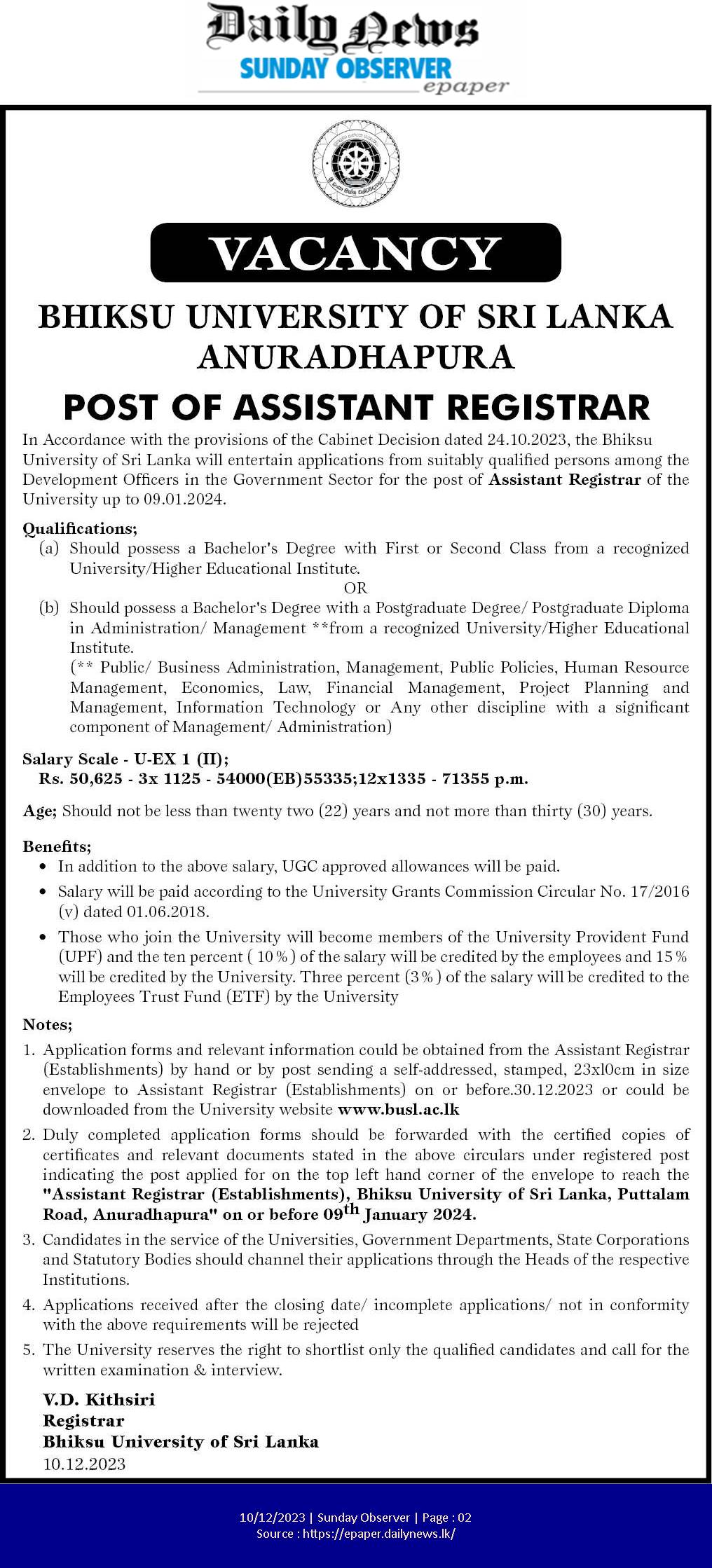 Assistant Registrar - Bhiksu University of Sri Lanka