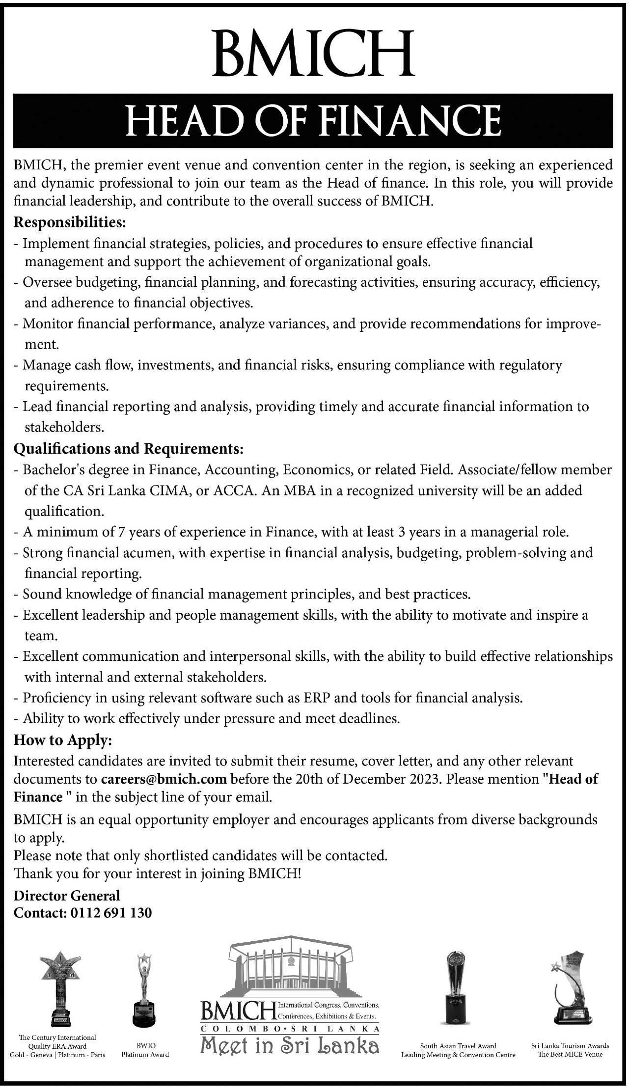 Head of Finance - Bandaranaike Memorial International Conference Hall