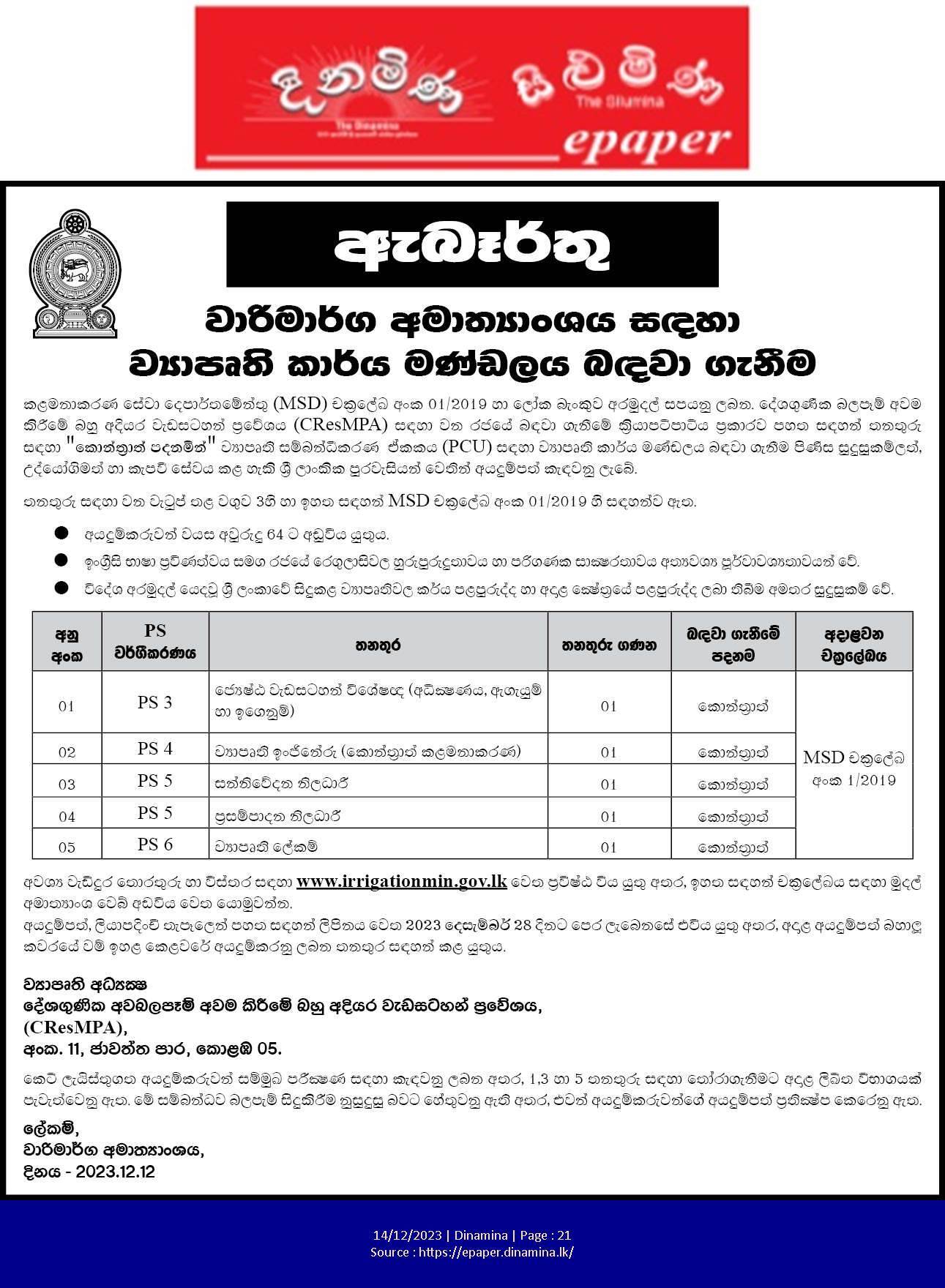 Senior Program Specialist, Project Engineer, Communication Officer - Ministry of Irrigation