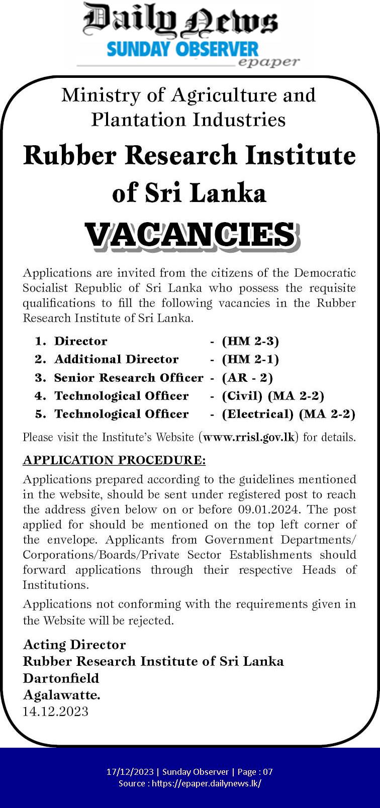 Director, Additional Director, Senior Research Officer - Rubber Research Institute of Sri Lanka
