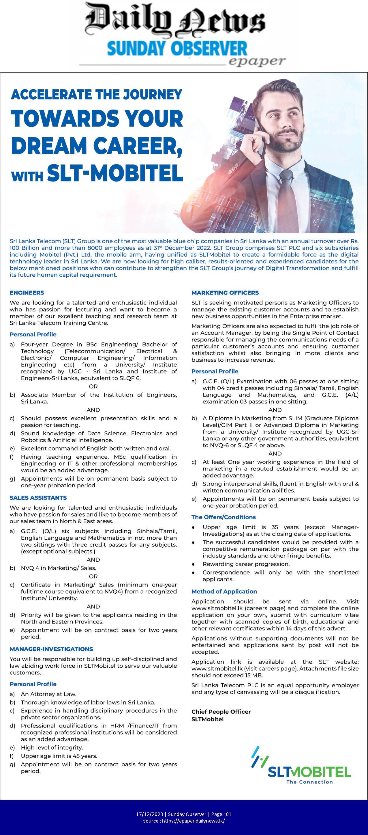 Engineer, Sales Assistant, Manager - Sri Lanka Telecom