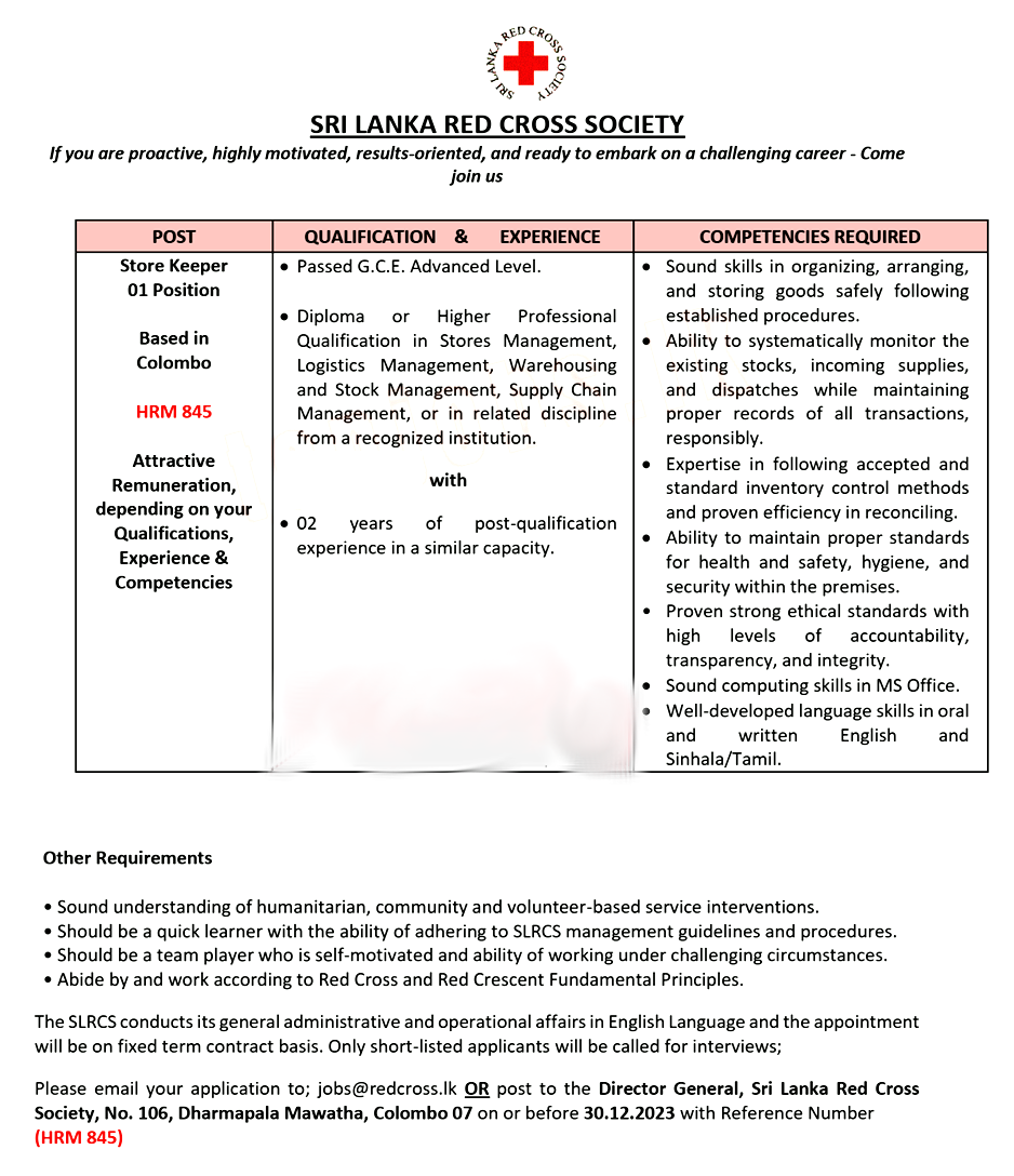 Store Keeper - Sri Lanka Red Cross Society