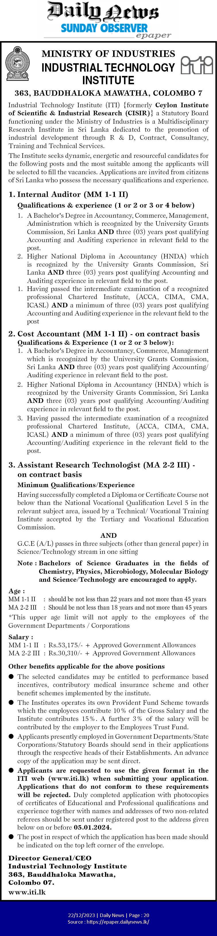Internal Auditor, Research Technologist, Cost Accountant - Industrial Technology Institute
