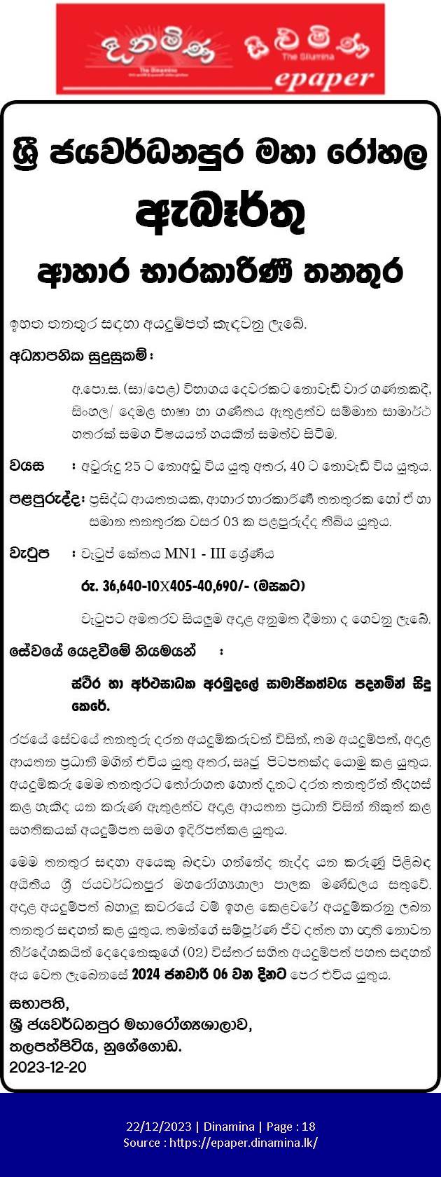 Diet Stewardess - Sri Jayewardenepura General Hospital