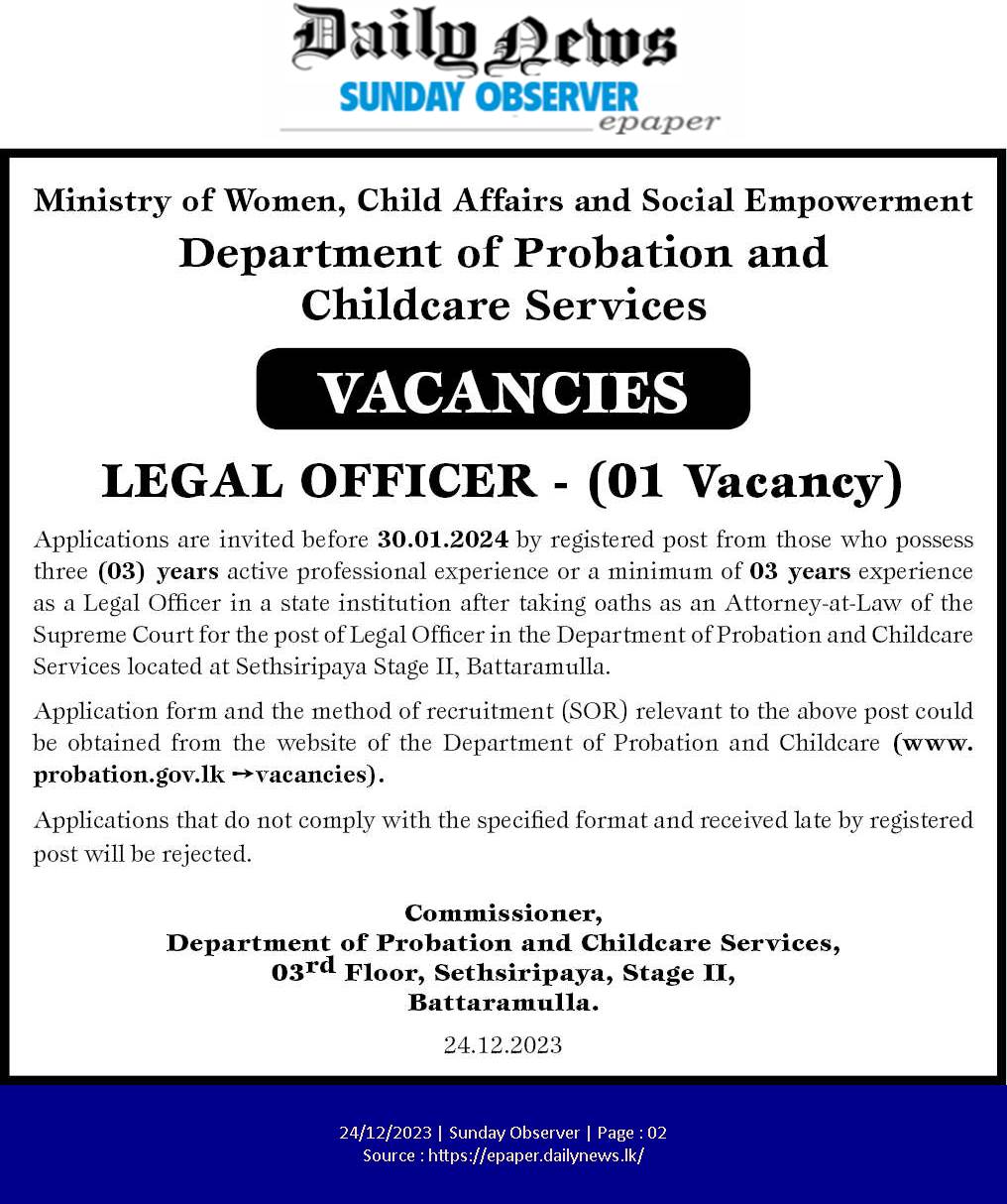 Legal Officer - Department of Probation and Child Care Services