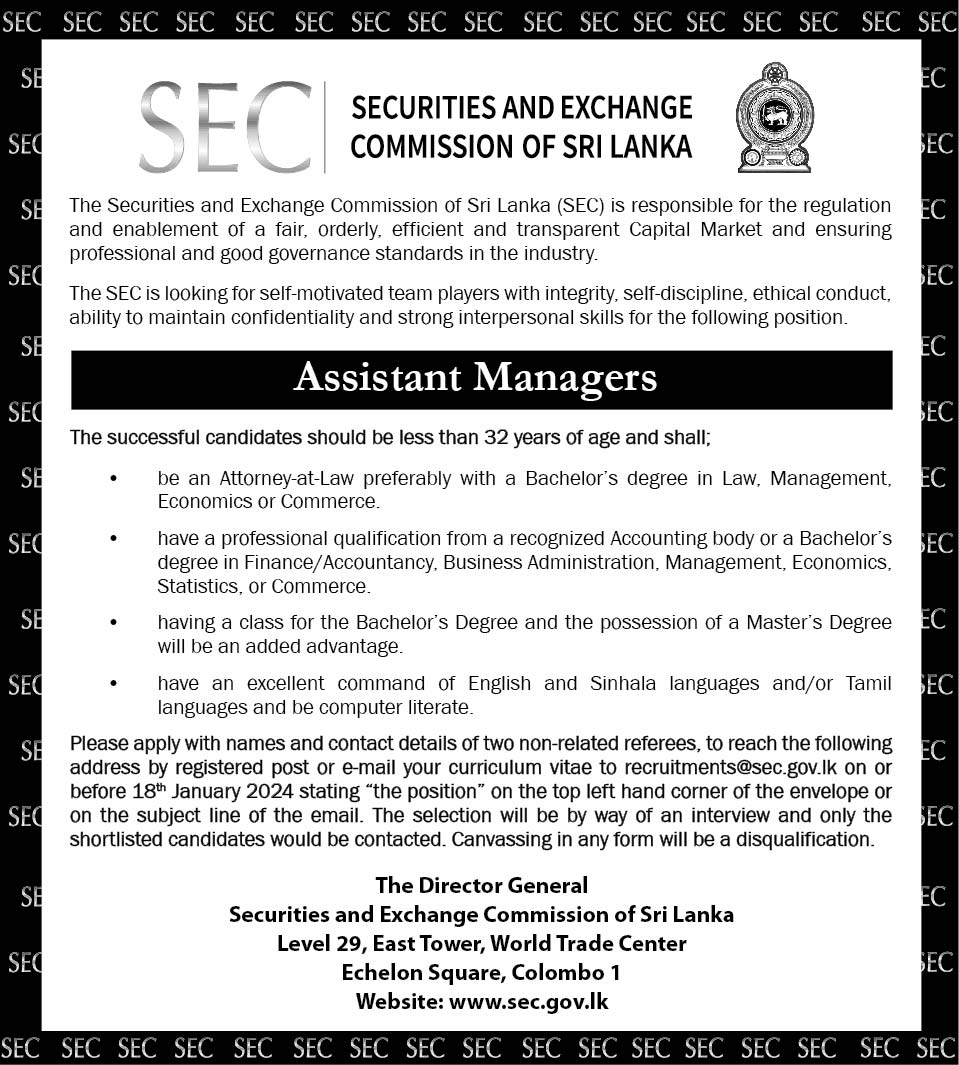 Assistant Manager - Securities and Exchange Commission of Sri Lanka