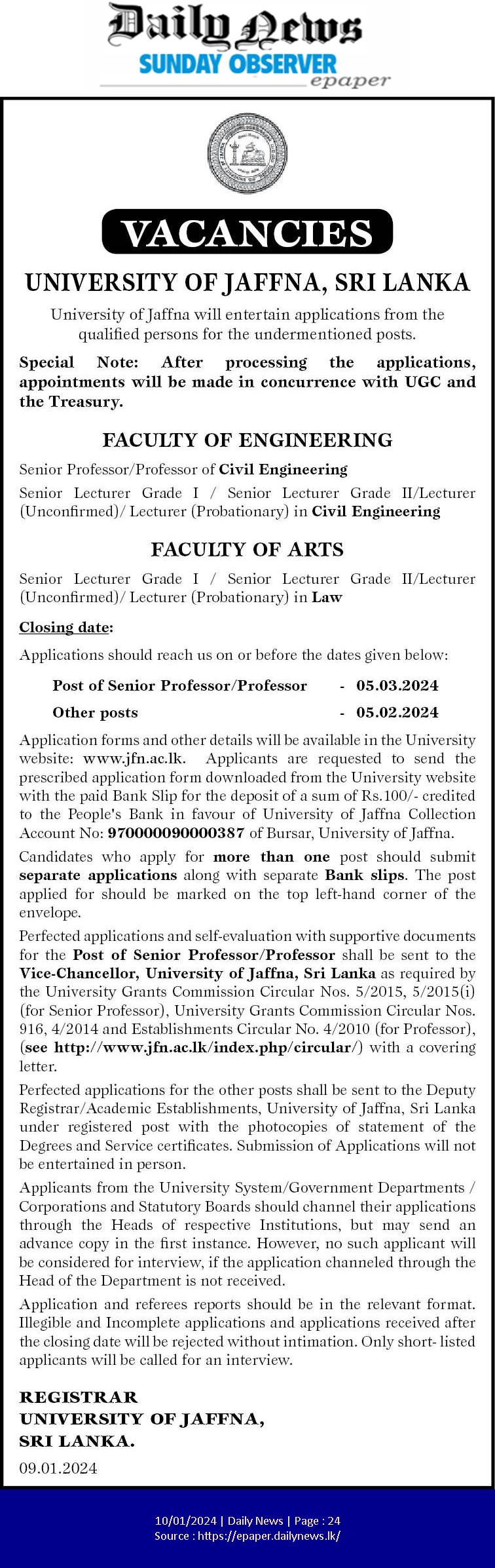 Senior Professor, Senior Lecture, Lecturer - University of Jaffna