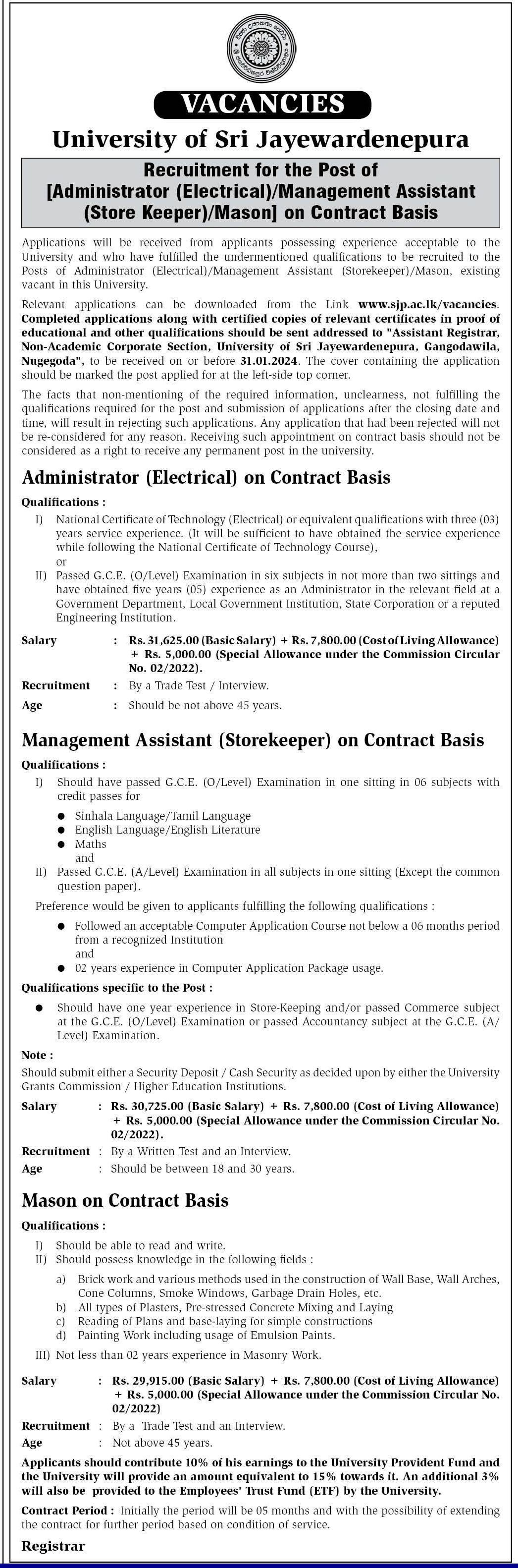 Administrator, Management Assistant, Mason - University of Sri Jayewardenepura