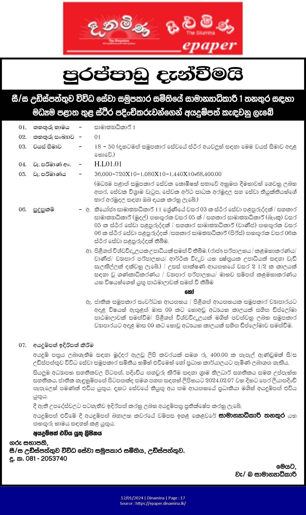 General Manager - Udispattuwa Multi Purpose Co Operative Society Limited