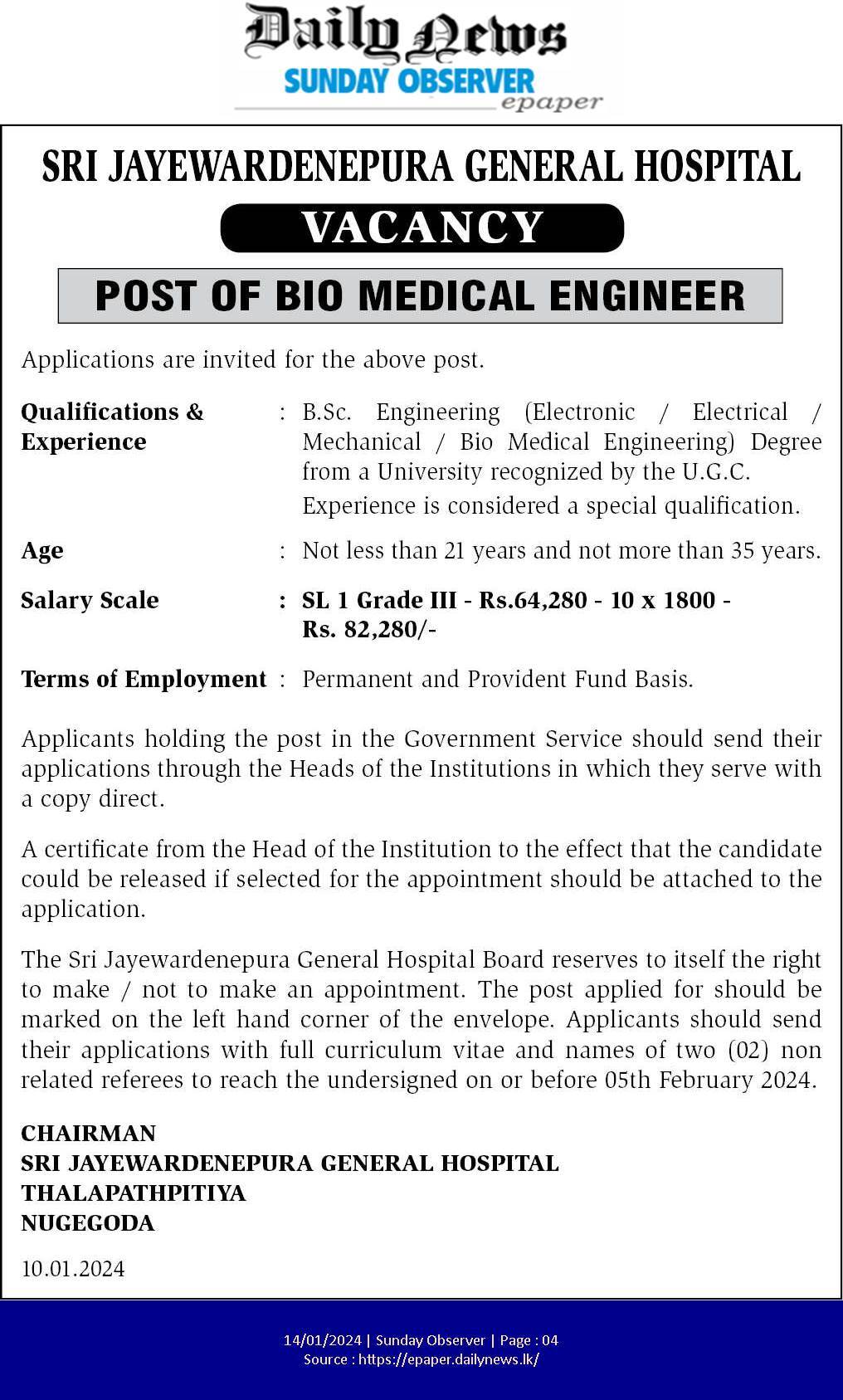 Biomedical Engineer - Sri Jayewardenepura General Hospital