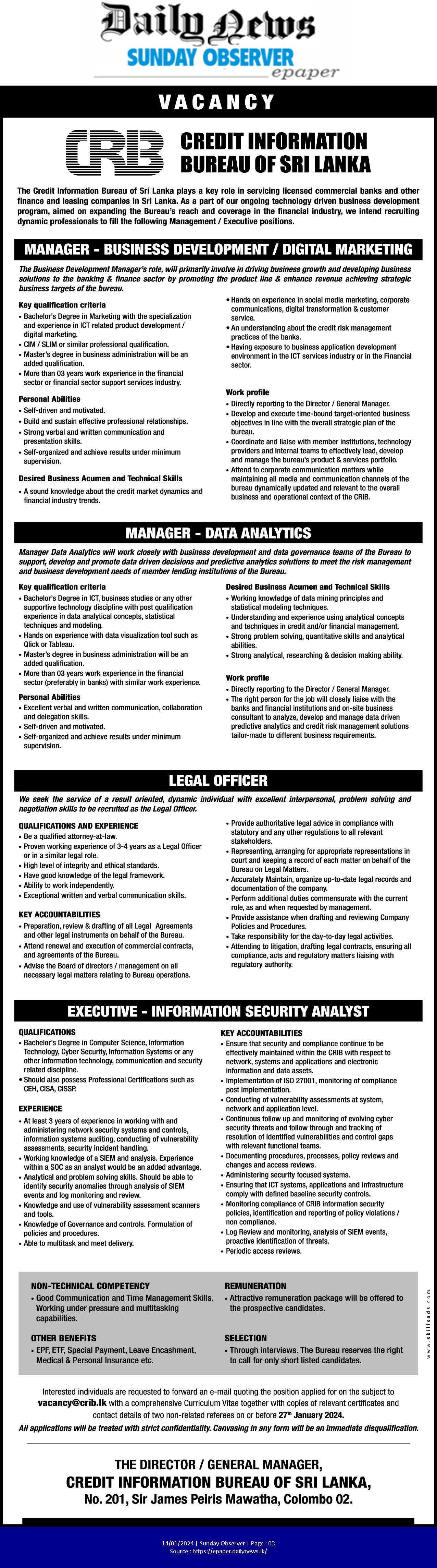 Manager, Legal Officer, Executive - Credit Information Bureau of Sri Lanka