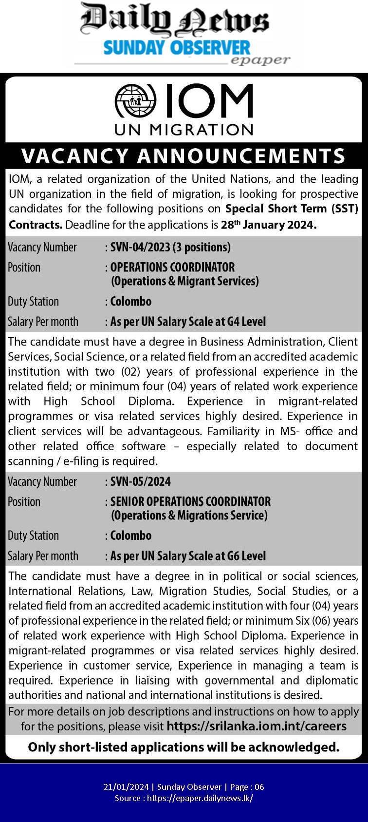 Operations Coordinator, Senior Operations Coordinator - International Organization for Migration