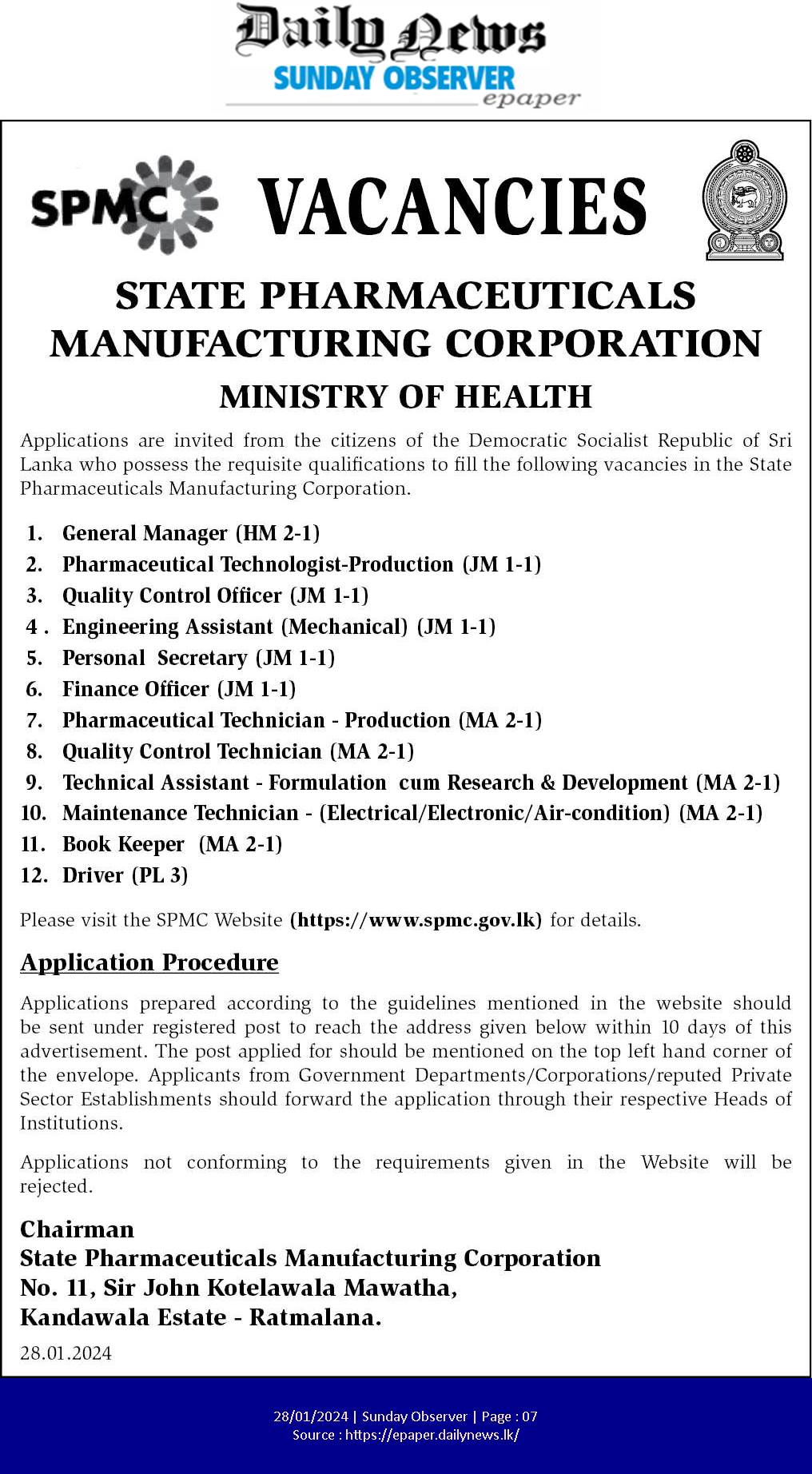 General Manager, pharmaceutical Technologist, Quality Control Officer - State Pharmaceuticals Manufacturing Corporation