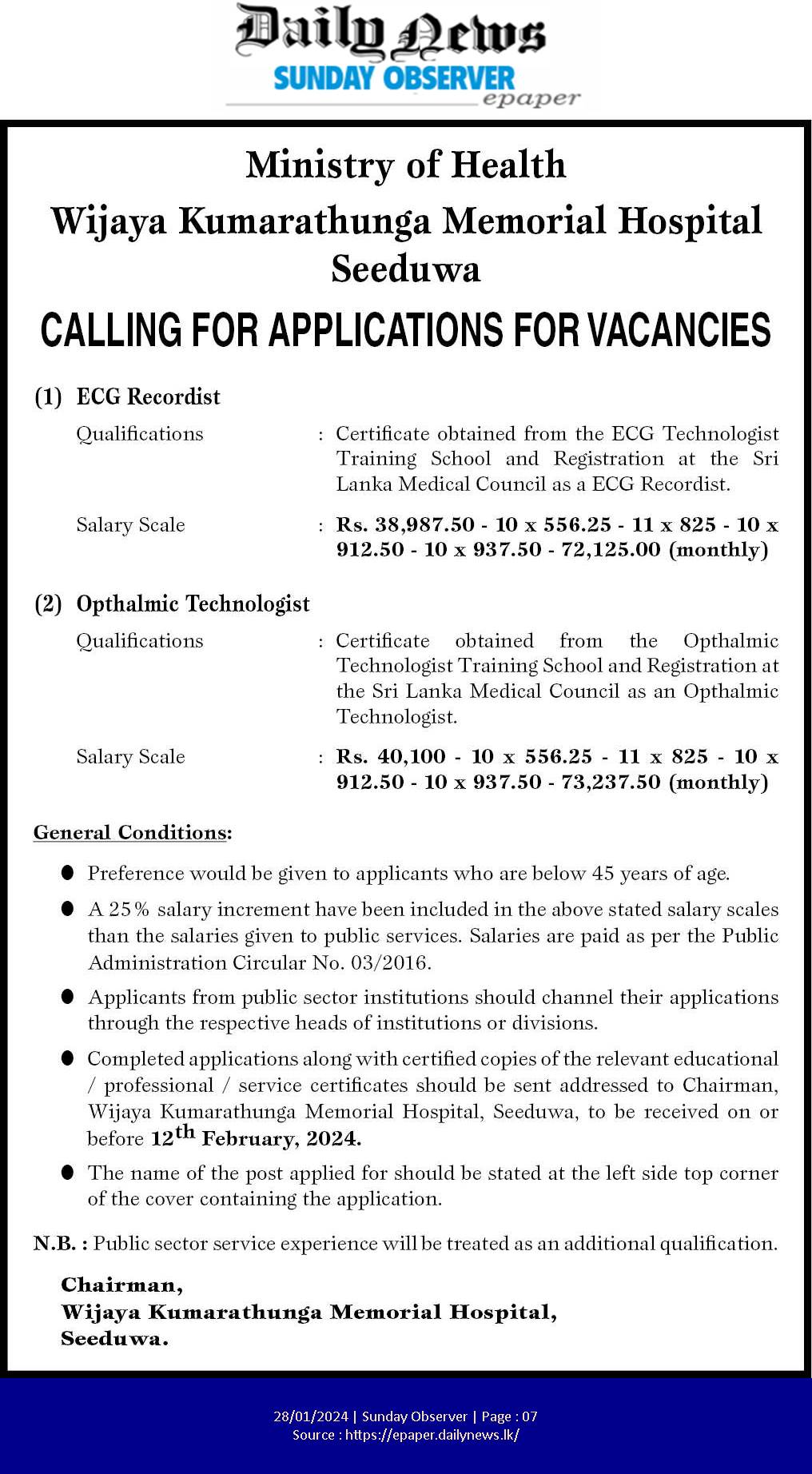 Electro Cardiographer, Ophthalmic Technologist - Wijaya Kumaratunga Memorial Hospital