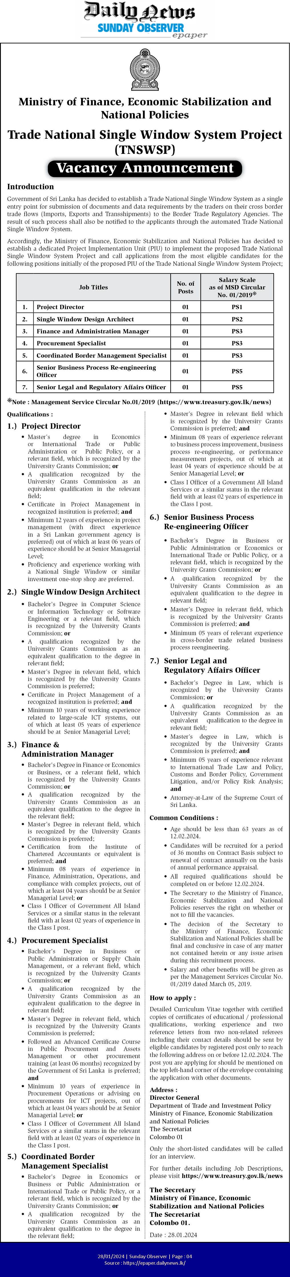 Project Director, Single Window architecture, Finance & Administration Manager - Ministry of Finance